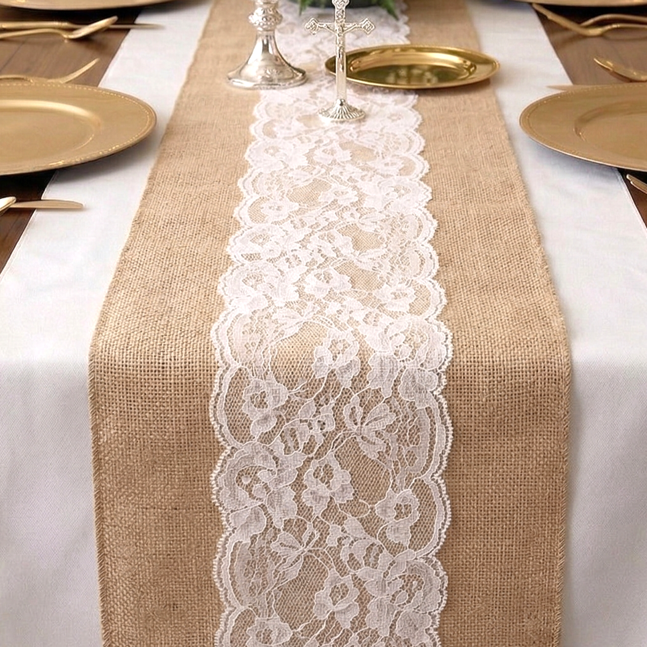 Bieżnik wykonany z materiału jutowego i koronki. Jasne i delikatne kolory w połączeniu z koronką przypadną do gustu Twoim bliskim i przygotują scenę do przygotowania całej aranżacji na weselny czy komunijny stół. Bieżnik to piękna dekoracja stołu, która wprowadzi niepowtarzalny klimat. Bieżnik można przyciąć na określoną długość.