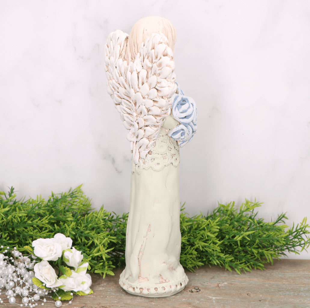 Anioł aniołek gipsowy koronka z kwiatami błękitny 33cm