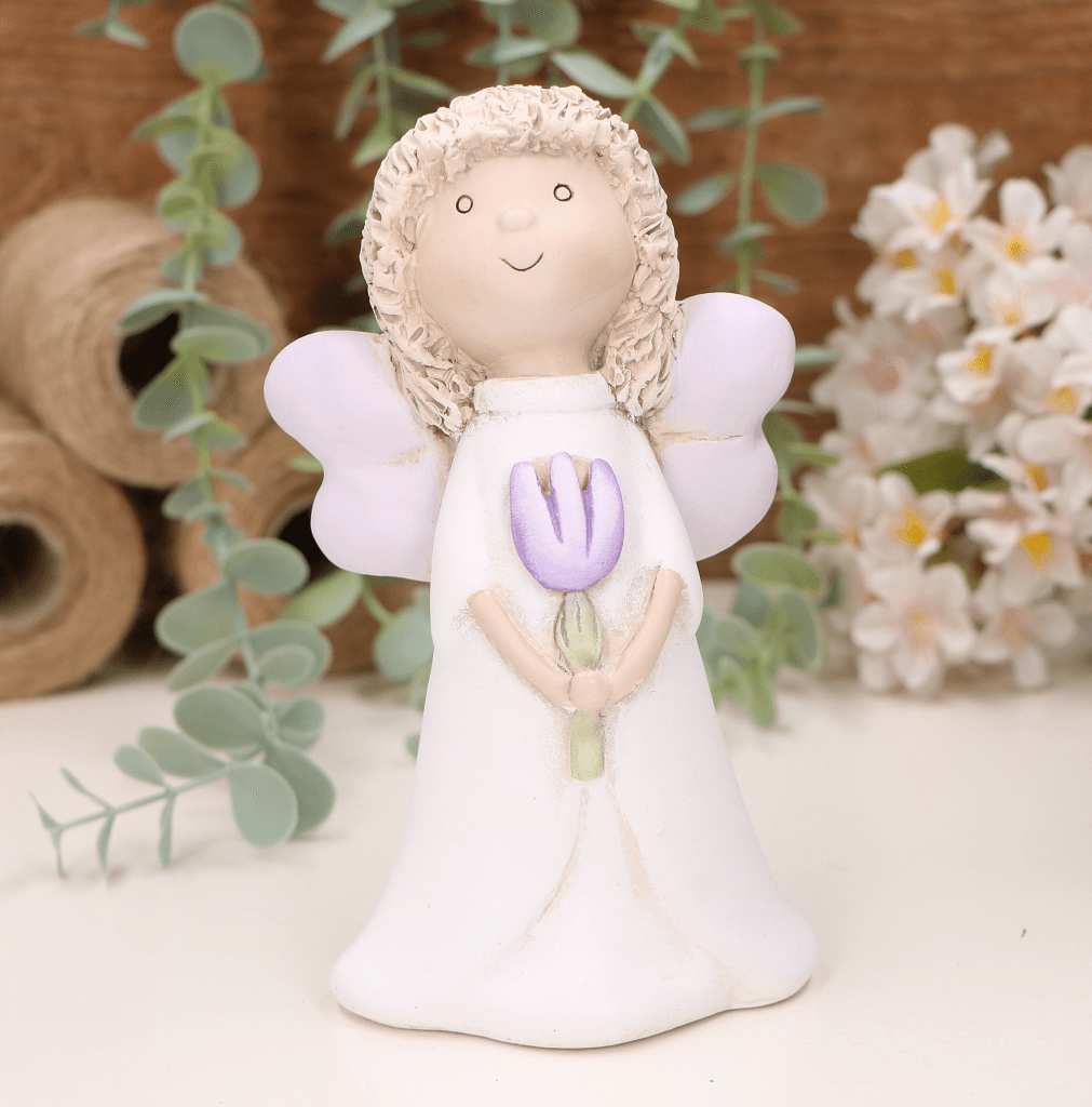 Aniołek dziewczynka z fioletowym tulipanem 16cm