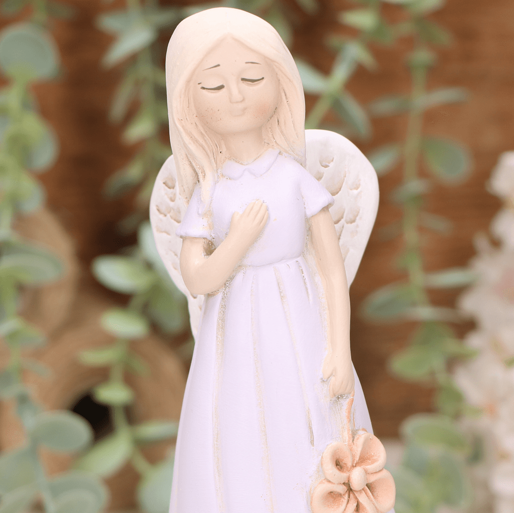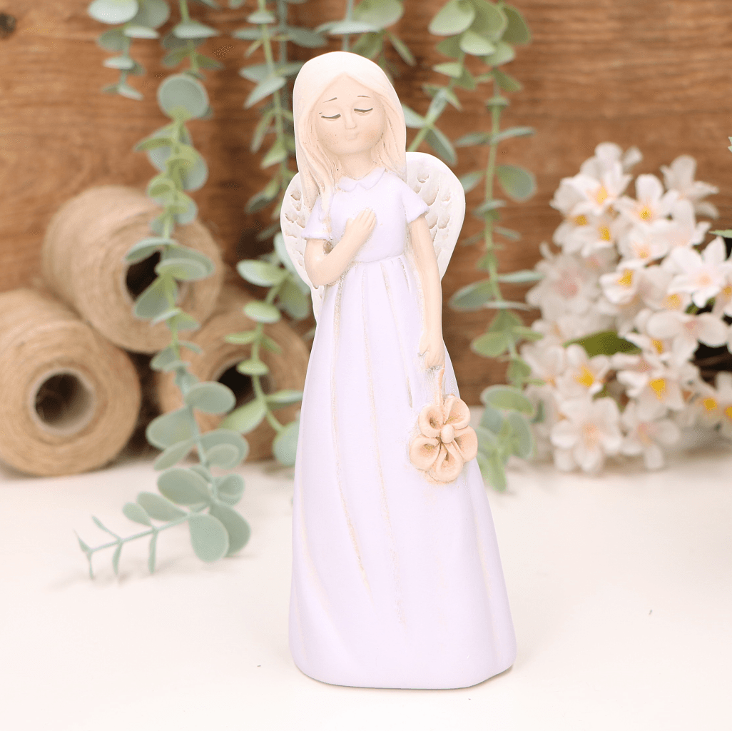 Aniołek dziewczynka z kwiatuszkiem 19cm fioletowy