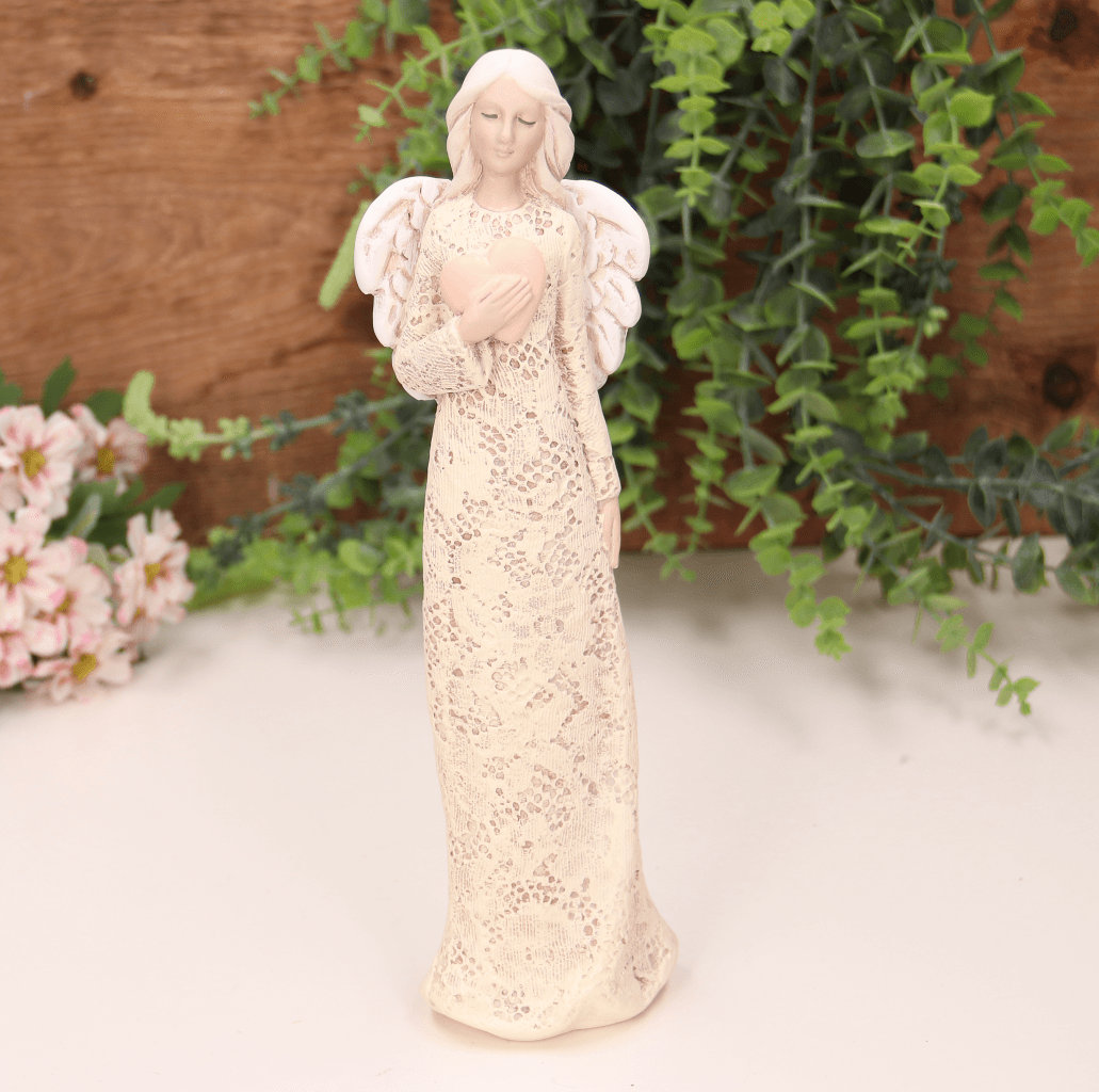 Aniołek ślubny w zdobionej sukni z sercem biały 25cm