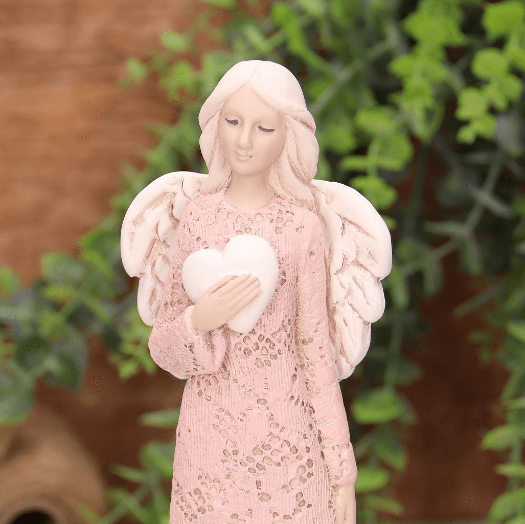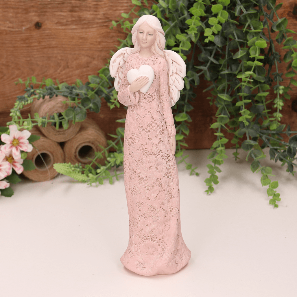 Aniołek ślubny w zdobionej sukni z sercem różowy 25cm