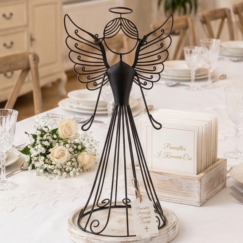 Ten elegancki metalowy aniołek o ażurowej konstrukcji to wyjątkowa dekoracja, która nada każdemu wnętrzu urok i symboliczny charakter. Wykonany z giętego metalu w kolorze czarnym, zachwyca precyzją detali i lekkością formy. Jego smukła sylwetka, finezyjnie wykonane skrzydła i delikatna aureola czynią go idealnym dodatkiem do świątecznego wystroju, ale sprawdzi się również jako całoroczna ozdoba o wyjątkowym przesłaniu. Aniołek doskonale prezentuje się na półce, komodzie lub parapecie, wprowadzając spokój i elegancję do każdego wnętrza.