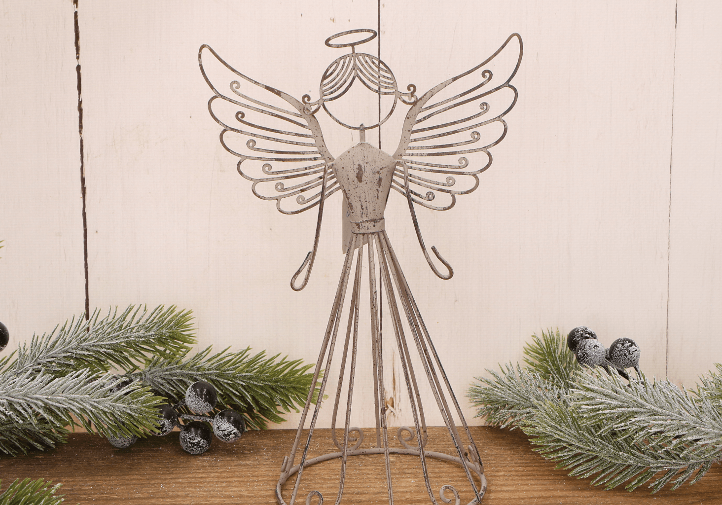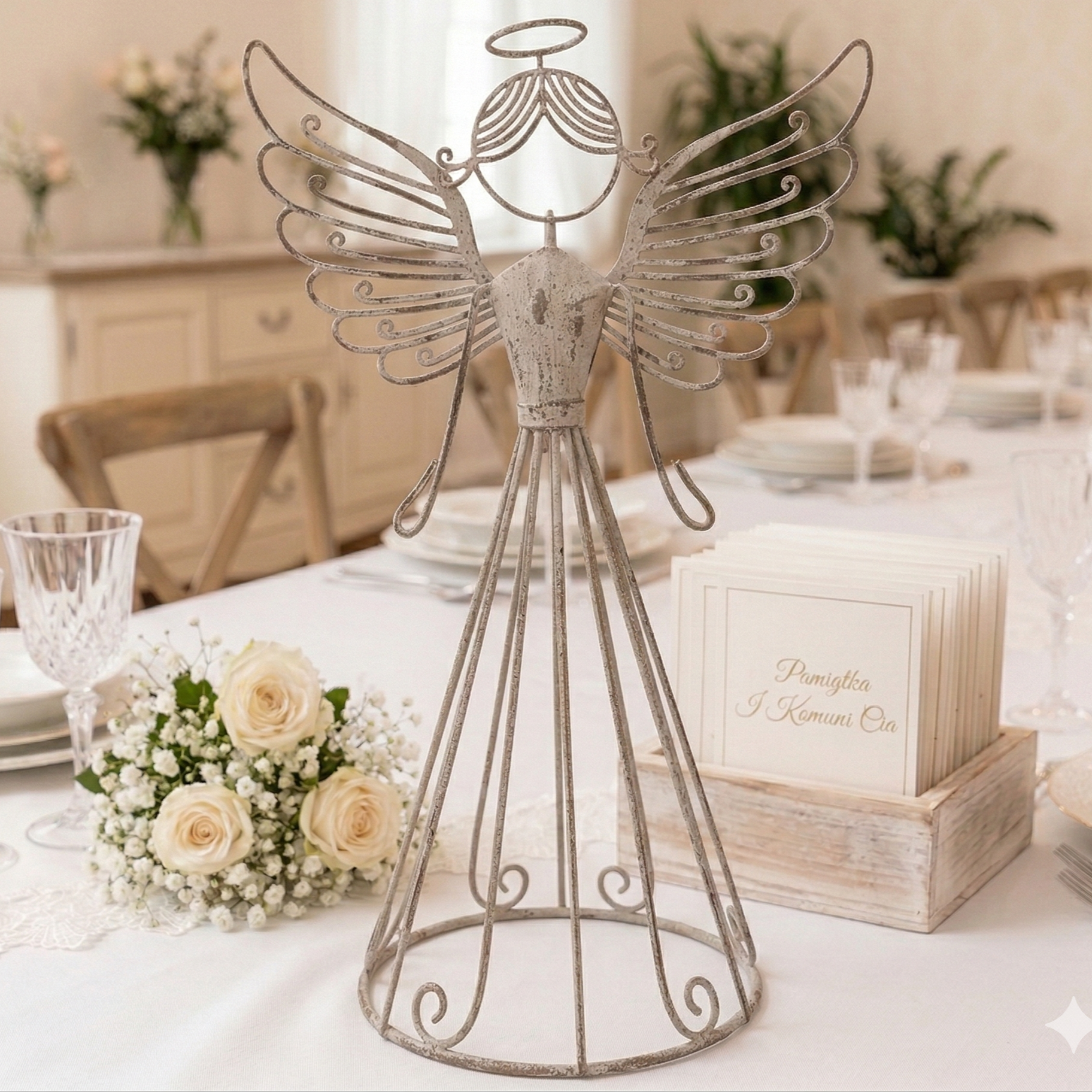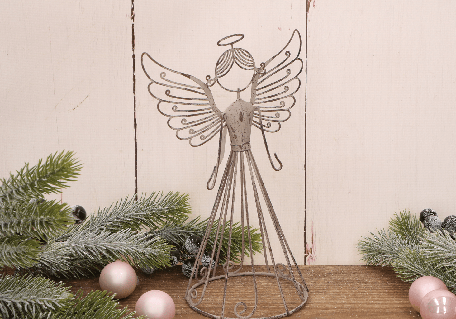 Ten uroczy aniołek z metalu w jasnym, postarzałym wykończeniu to idealna dekoracja, która doda wnętrzu ciepła, harmonii i świątecznej atmosfery. Jego ażurowa forma i delikatne skrzydła wykonane z finezyjnie giętych drutów nadają mu lekkości i elegancji. Anioł doskonale sprawdzi się jako ozdoba na komodzie, parapecie czy stole, a także jako symboliczny prezent dla bliskiej osoby. Dzięki solidnemu wykonaniu i klasycznemu stylowi pasuje zarówno do wnętrz nowoczesnych, jak i rustykalnych. To ponadczasowa dekoracja, która wprowadza do domu spokój i wyjątkowy klimat.