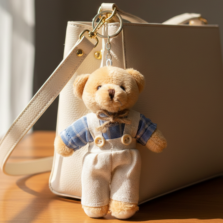 Uroczy brelok do kluczy w kształcie misia chłopca to stylowy i praktyczny dodatek, który sprawdzi się na co dzień. Wykonany z miękkiego, przyjemnego w dotyku pluszu, zachwyca starannym wykończeniem oraz modnym ubrankiem w kratkę z ogrodniczkami. Subtelne detale i klasyczna kolorystyka nadają mu wyjątkowego uroku. Dzięki solidnemu metalowemu kółku brelok można łatwo przypiąć do kluczy, plecaka, torebki czy piórnika. To nie tylko funkcjonalny gadżet, ale również sympatyczna ozdoba i świetny pomysł na drobny prezent dla dziecka lub bliskiej osoby. Idealny jako codzienny, dekoracyjny akcent.
