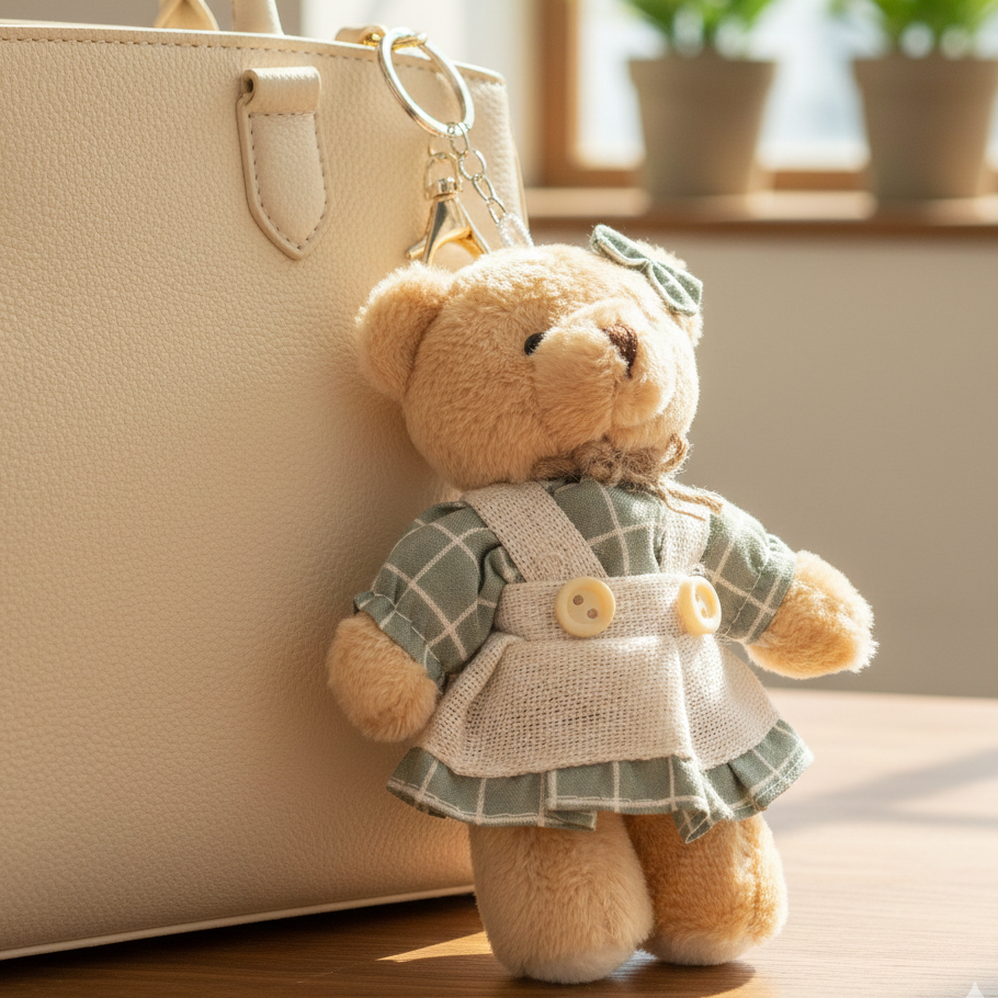 Uroczy brelok do kluczy w kształcie misia dziewczynki to wyjątkowy dodatek, który zachwyca miękkim wykończeniem i starannymi detalami. Pluszowy miś ubrany jest w stylową sukienkę z delikatnym wzorem oraz ozdobną kokardkę, co nadaje mu subtelnego, dziewczęcego charakteru. Wykonany z przyjemnego w dotyku materiału, doskonale sprawdzi się jako brelok do kluczy, plecaka, torebki lub piórnika. Solidne metalowe kółko umożliwia łatwe i bezpieczne przypięcie. To nie tylko praktyczny gadżet, ale również urocza dekoracja i świetny pomysł na drobny prezent dla dziecka lub bliskiej osoby. Idealny jako stylowy dodatek na co dzień.