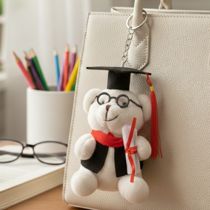 Uroczy brelok do kluczy w kształcie misia 10 cm to stylowy dodatek, który doda charakteru kluczom, torebce lub plecakowi. Pluszowy miś w kolorze white ubrany jest w elegancki strój z kapeluszem i ozdobnymi detalami, co nadaje mu wyjątkowego, oryginalnego wyglądu. Starannie wykonane elementy oraz miękki materiał sprawiają, że breloczek prezentuje się estetycznie i przyciąga uwagę. Dzięki solidnemu kółku można go łatwo przypiąć do kluczy lub akcesoriów. To idealny gadżet dekoracyjny oraz świetny pomysł na drobny prezent. Pluszowy brelok miś łączy funkcjonalność z modnym designem.