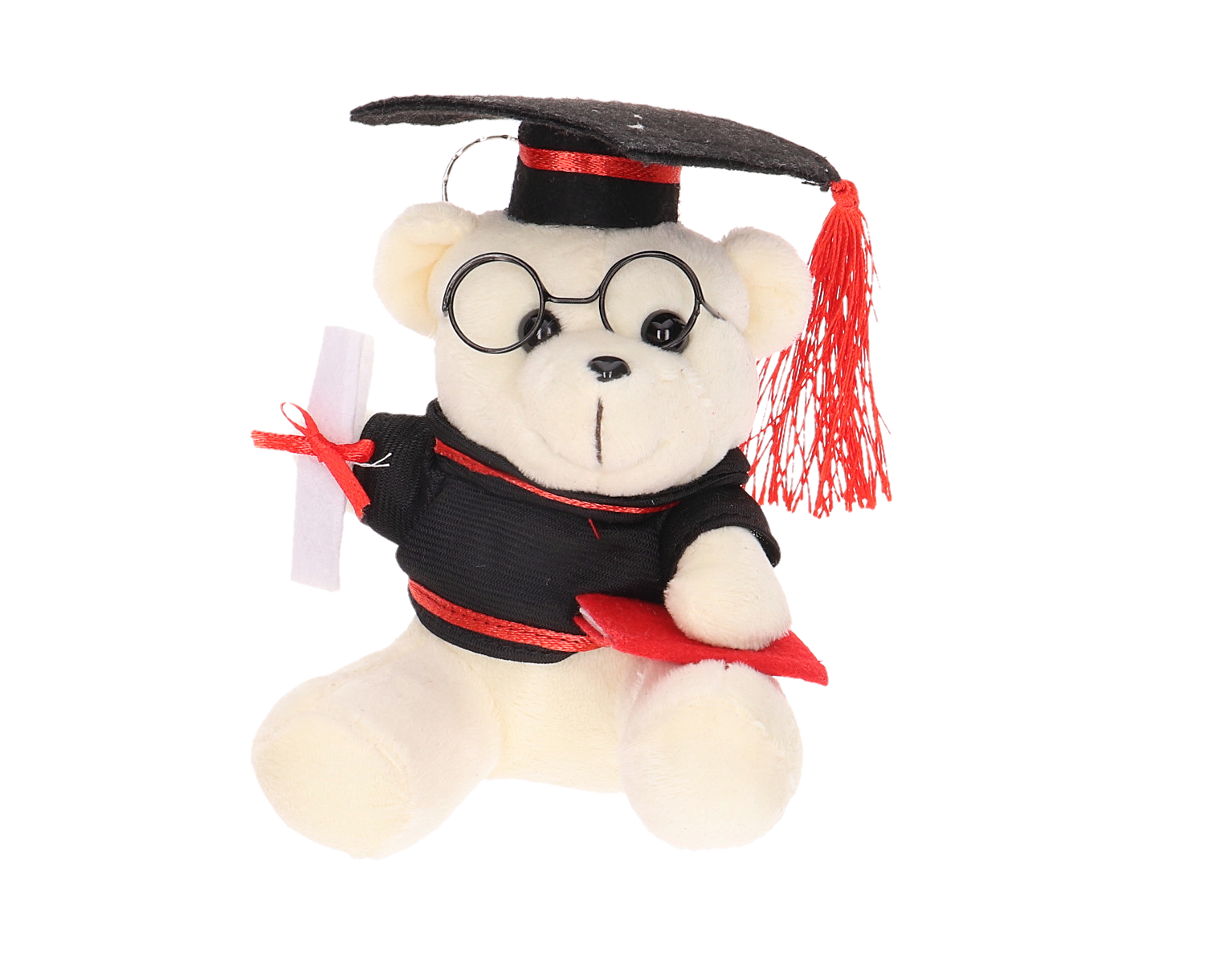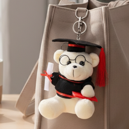 Uroczy brelok do kluczy w kształcie białego misia Profesorka to wyjątkowa i symboliczna pamiątka na zakończenie szkoły, studiów lub ważnego etapu edukacji. Miś ubrany jest w klasyczną czapkę absolwenta z czerwonym chwostem, czarną togę z czerwonymi akcentami oraz stylowe okulary. W łapce trzyma dyplom przewiązany wstążką, co podkreśla jego akademicki charakter. Wykonany z miękkiego, przyjemnego w dotyku pluszu, sprawdzi się jako praktyczny brelok do kluczy oraz dekoracja plecaka czy torby. Solidne metalowe kółko zapewnia wygodne i trwałe mocowanie. To idealny prezent gratulacyjny i pamiątka sukcesu dla dzieci, młodzieży i dorosłych.