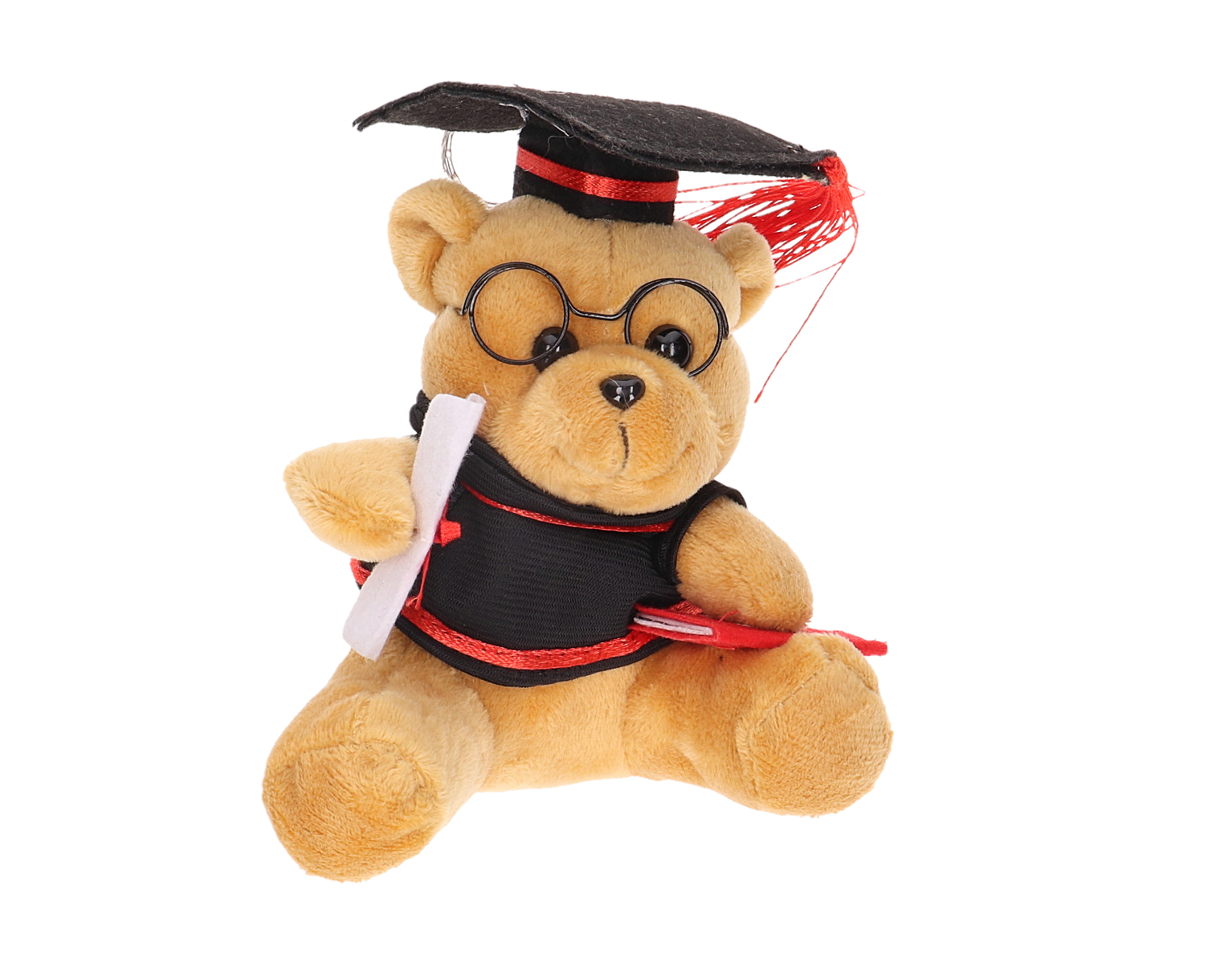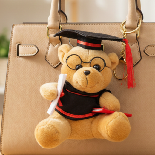 Efektowny brelok do kluczy w kształcie misia Profesorka to większa, jeszcze bardziej dekoracyjna wersja popularnego upominku na zakończenie szkoły lub studiów. Brązowy miś ubrany jest w strój absolwenta – czarną czapkę z czerwonym chwostem, elegancką togę oraz trzyma dyplom. Dodatkowym atutem są stylowe okulary, które nadają mu wyjątkowego charakteru. Wykonany z miękkiego, przyjemnego w dotyku pluszu, stanowi nie tylko praktyczny brelok do kluczy, ale także uroczą ozdobę plecaka czy torby. Solidne metalowe kółko zapewnia wygodne i trwałe mocowanie. To idealny prezent gratulacyjny, pamiątka ukończenia szkoły lub studiów.