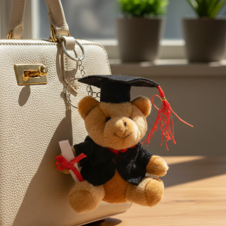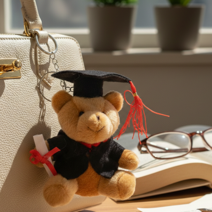 Uroczy brelok do kluczy w kształcie misia Profesorka to wyjątkowy i oryginalny dodatek, który przyciąga uwagę swoim akademickim strojem. Miś ubrany jest w czapkę absolwenta z czerwonym chwostem oraz elegancką pelerynkę, a w łapce trzyma dyplom przewiązany wstążką. Wykonany z miękkiego, przyjemnego w dotyku pluszu, stanowi nie tylko praktyczny gadżet do kluczy, ale także sympatyczną ozdobę plecaka, torby czy piórnika. Solidne metalowe kółko umożliwia łatwe i bezpieczne przypięcie. To idealny upominek na zakończenie roku szkolnego, studia lub jako symboliczny prezent gratulacyjny. Mały, ale efektowny dodatek dla dzieci i dorosłych.