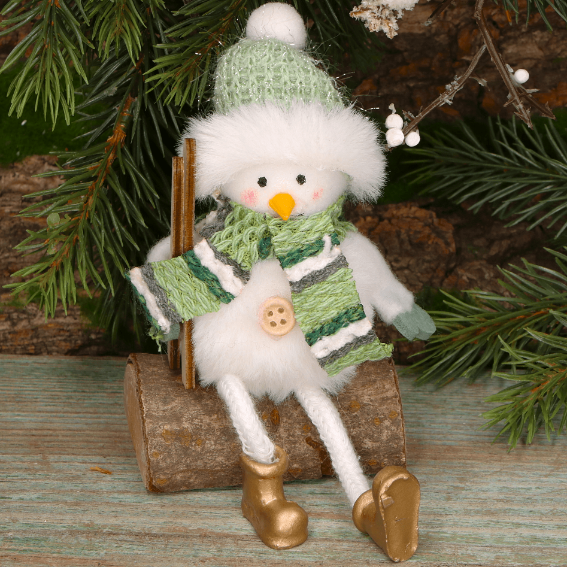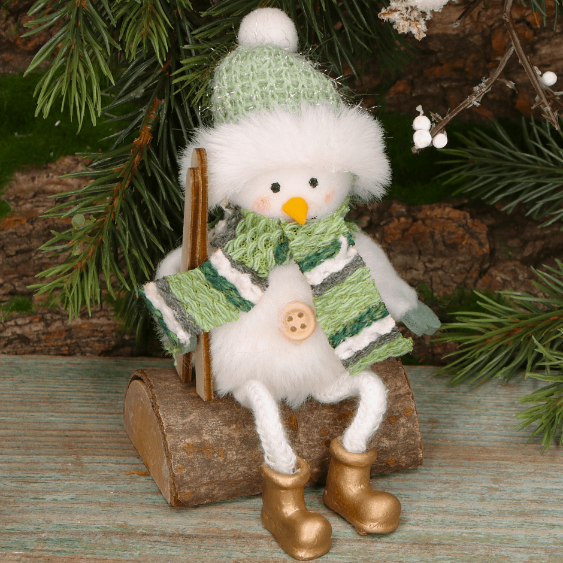 Uroczy bałwanek siedzący na kawałku drewna to pełna wdzięku dekoracja, która idealnie dopełni zimowe i świąteczne aranżacje wnętrz. Wykonany z miękkiego materiału, ubrany w zieloną czapkę z pomponem, szalik oraz rękawiczki, prezentuje się niezwykle przytulnie i radośnie. Dodatkowym akcentem są miniaturowe narty, które bałwanek trzyma w ręce, co podkreśla jego zimowy charakter. Jego złote buciki i przyszyty guzik dodają mu wyjątkowego uroku. Doskonały do postawienia na stole, półce, komodzie czy jako element stroika. To także świetny pomysł na drobny, świąteczny prezent.