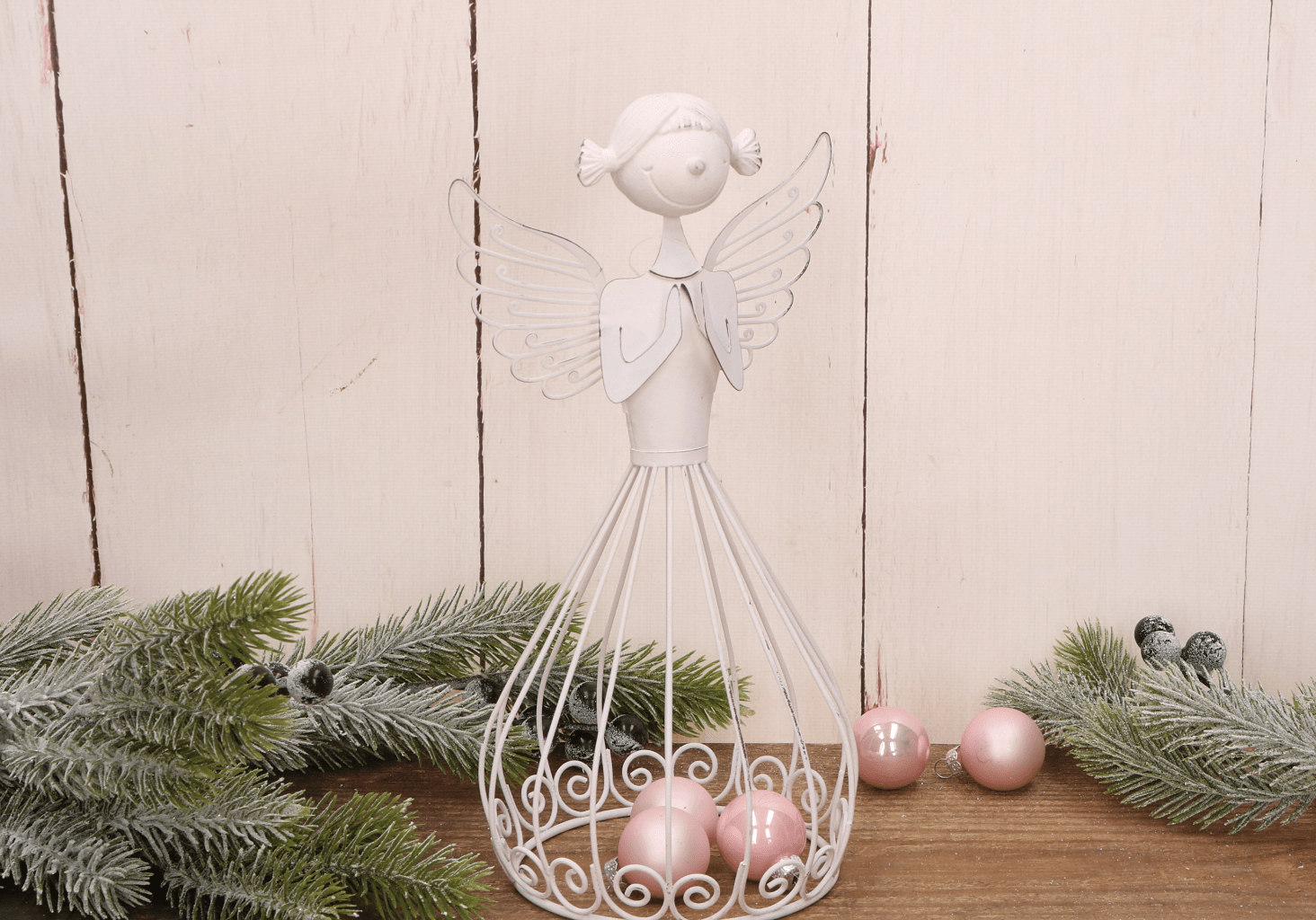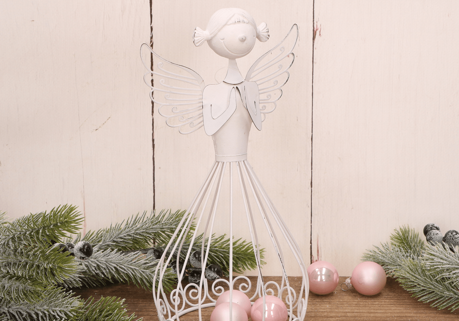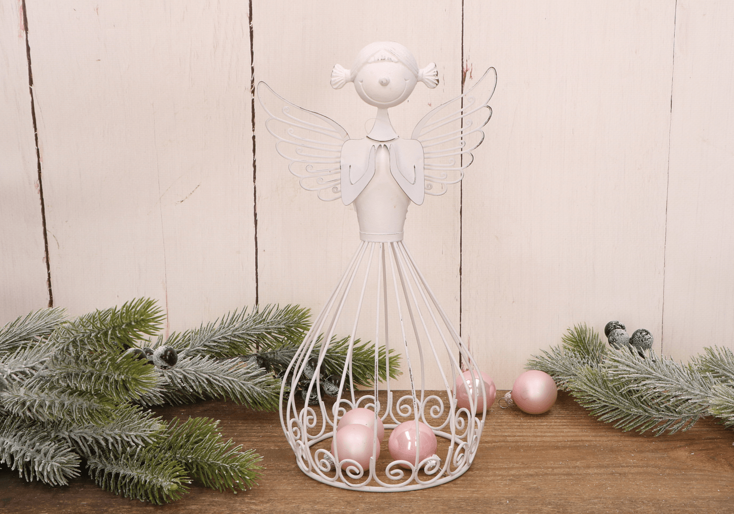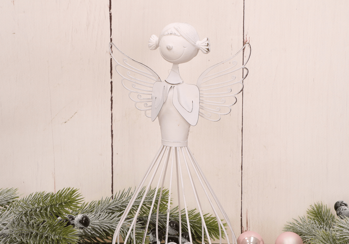 Biały ażurowy metalowy anioł dekoracyjny w geście modlitwy – 25,5 cm