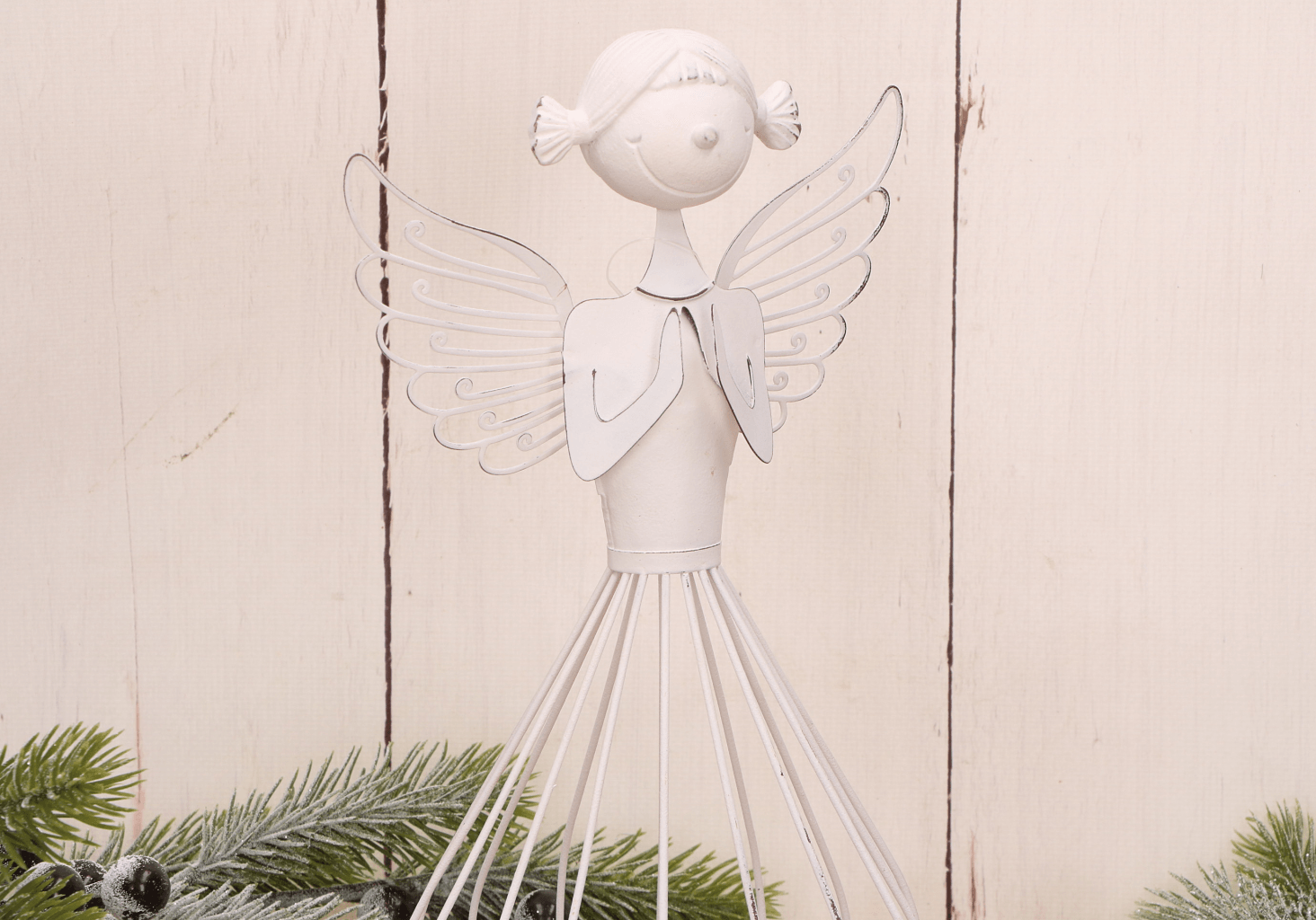 Biały ażurowy metalowy anioł dekoracyjny w geście modlitwy