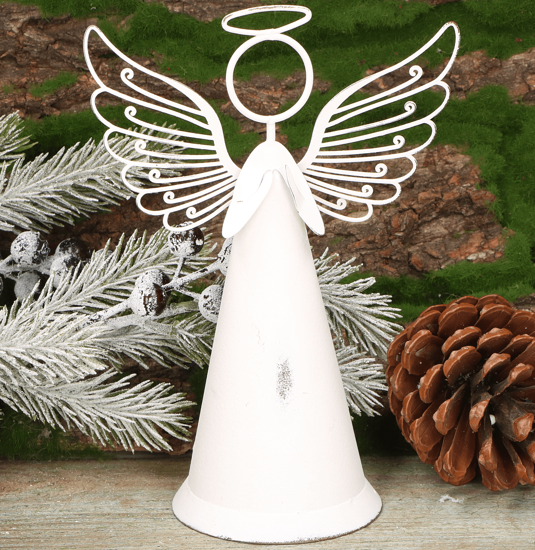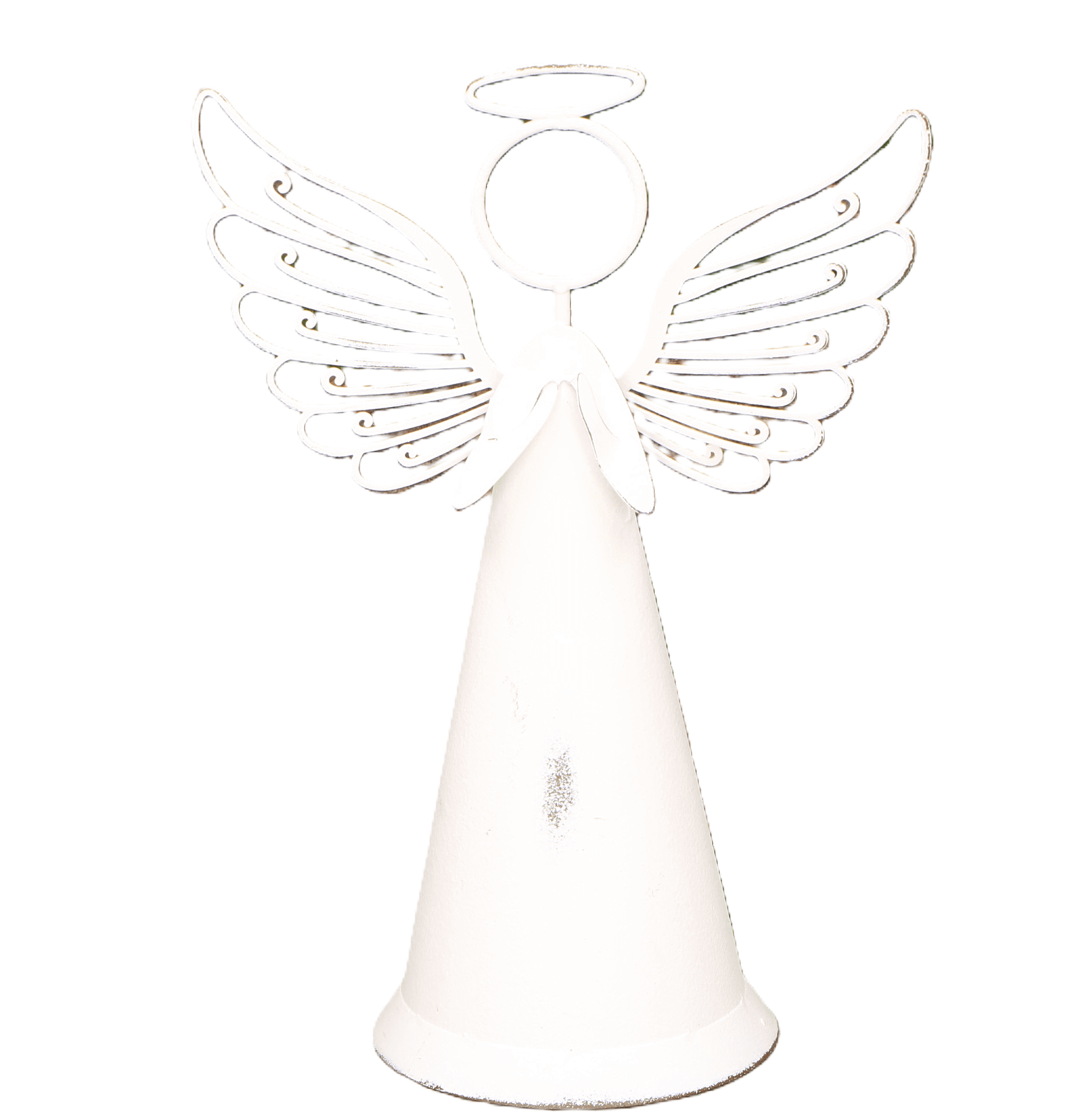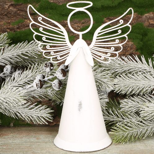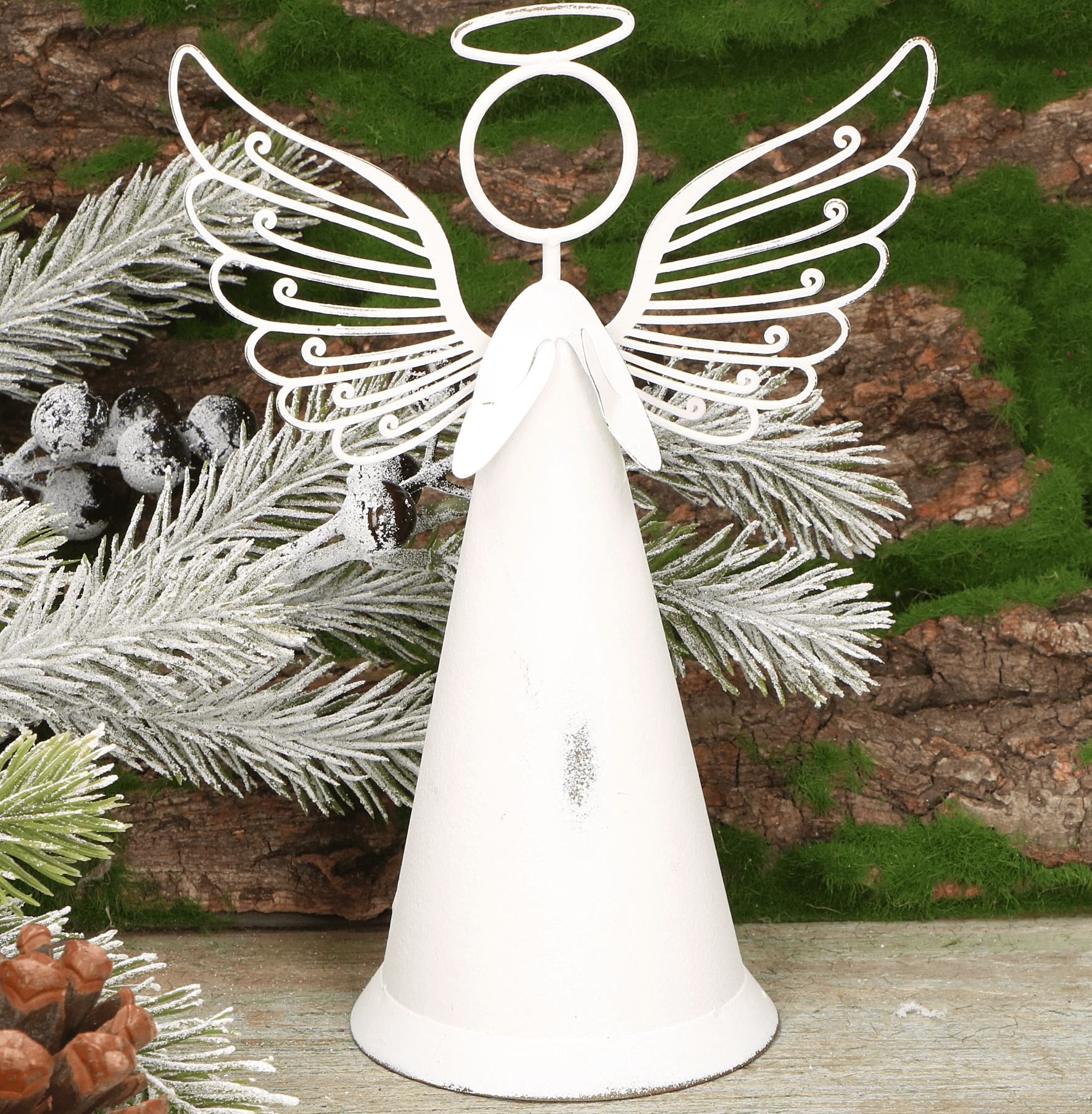 Biały metalowy anioł dekoracyjny ze złożonymi dłońmi – 19,5 cm