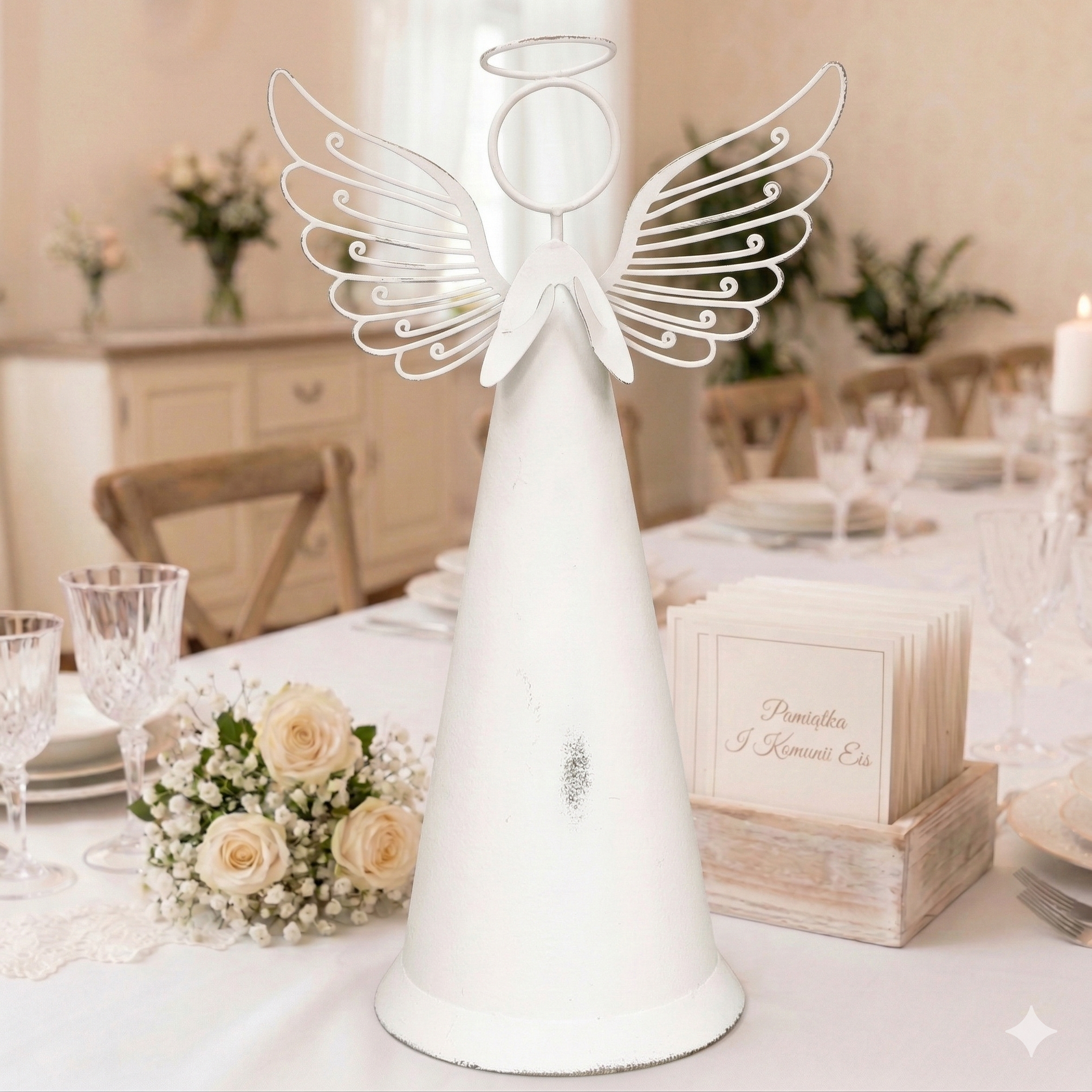 Ten metalowy aniołek w kolorze białym to subtelna i elegancka dekoracja, która wnosi do wnętrza spokój, ciepło i świąteczny nastrój. Prosta forma w połączeniu z ozdobnymi skrzydłami i złożonymi dłońmi sprawia, że idealnie komponuje się zarówno z klasycznymi, jak i nowoczesnymi aranżacjami. Postarzane detale dodają mu uroku w stylu vintage, a solidne wykonanie zapewnia trwałość na wiele sezonów. Aniołek świetnie prezentuje się na półce, komodzie, parapecie, a także jako symboliczny prezent dla bliskiej osoby.