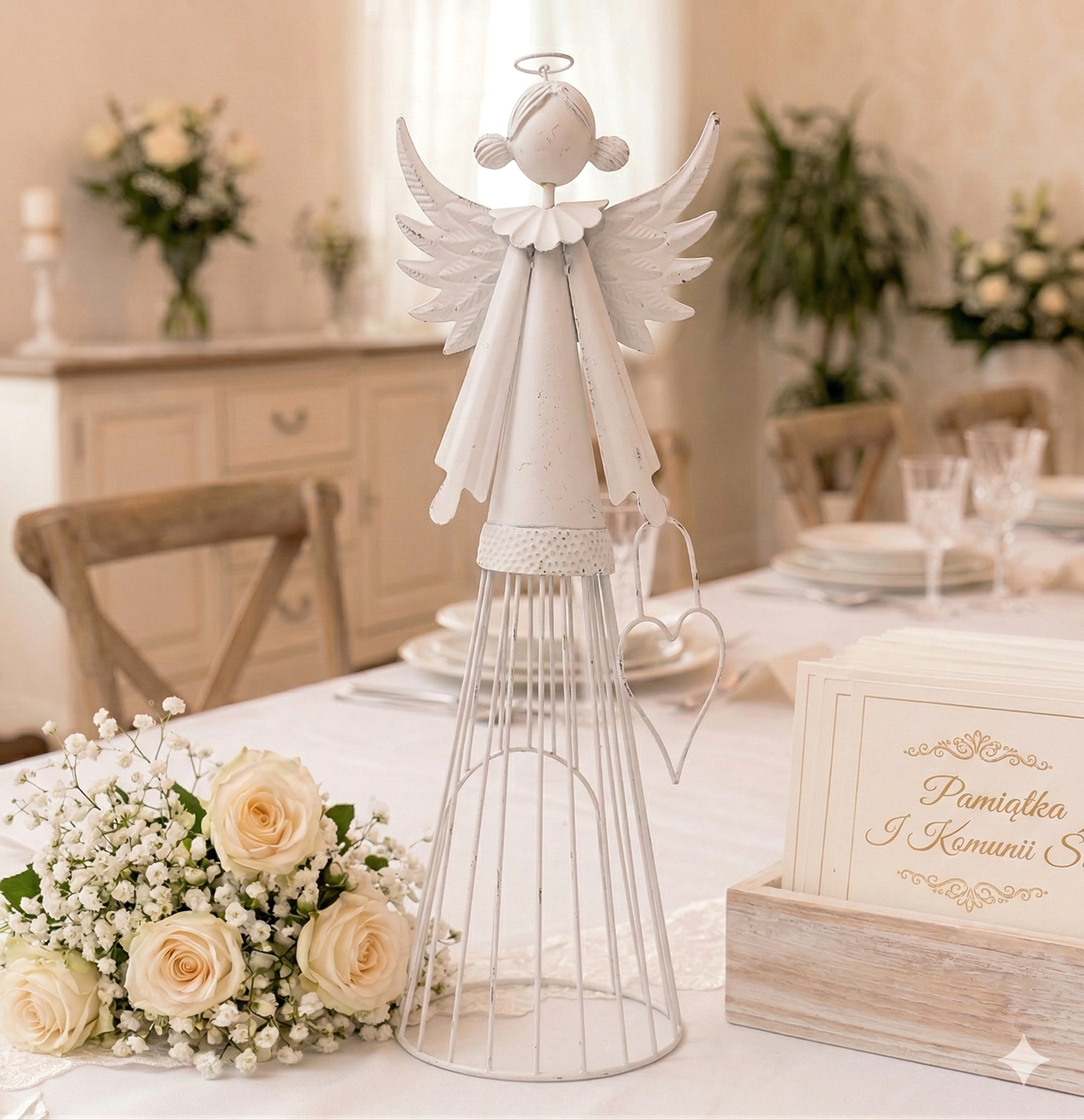 Stylowy biały metalowy anioł, który może pełnić funkcję świecznika na tealight, to idealna dekoracja świąteczna, która doda Twojemu wnętrzu ciepła i uroku. Dzięki swojej delikatnej, ażurowej konstrukcji anioł subtelnie rozprasza światło, tworząc przytulną atmosferę w każdym pomieszczeniu. Dekoracyjny akcent w postaci serca dodaje całości wyjątkowego charakteru. Jego prosty, ale elegancki design świetnie komponuje się z innymi świątecznymi ozdobami, a metalowa konstrukcja zapewnia trwałość i stabilność. Idealny na stół, kominek lub parapet.
