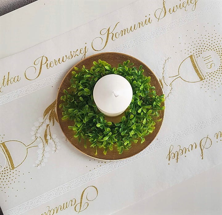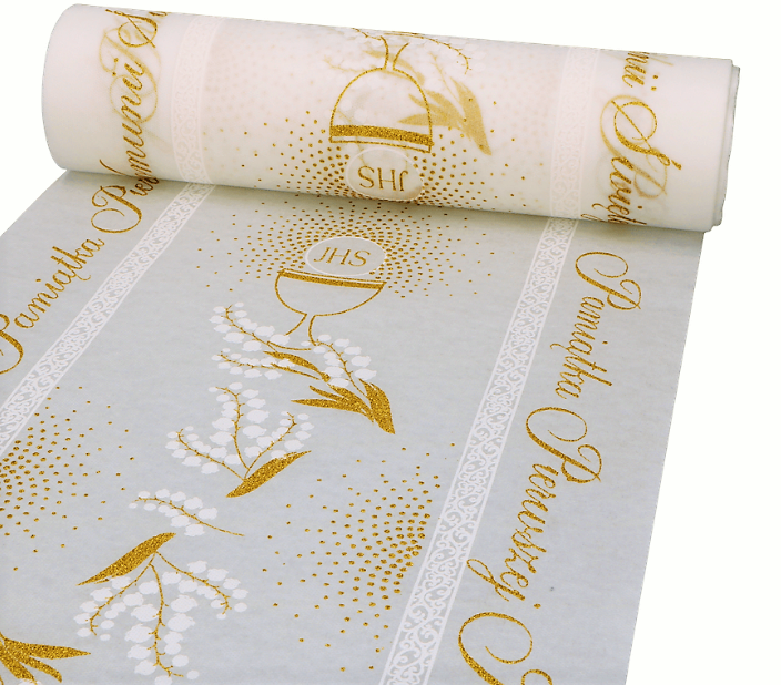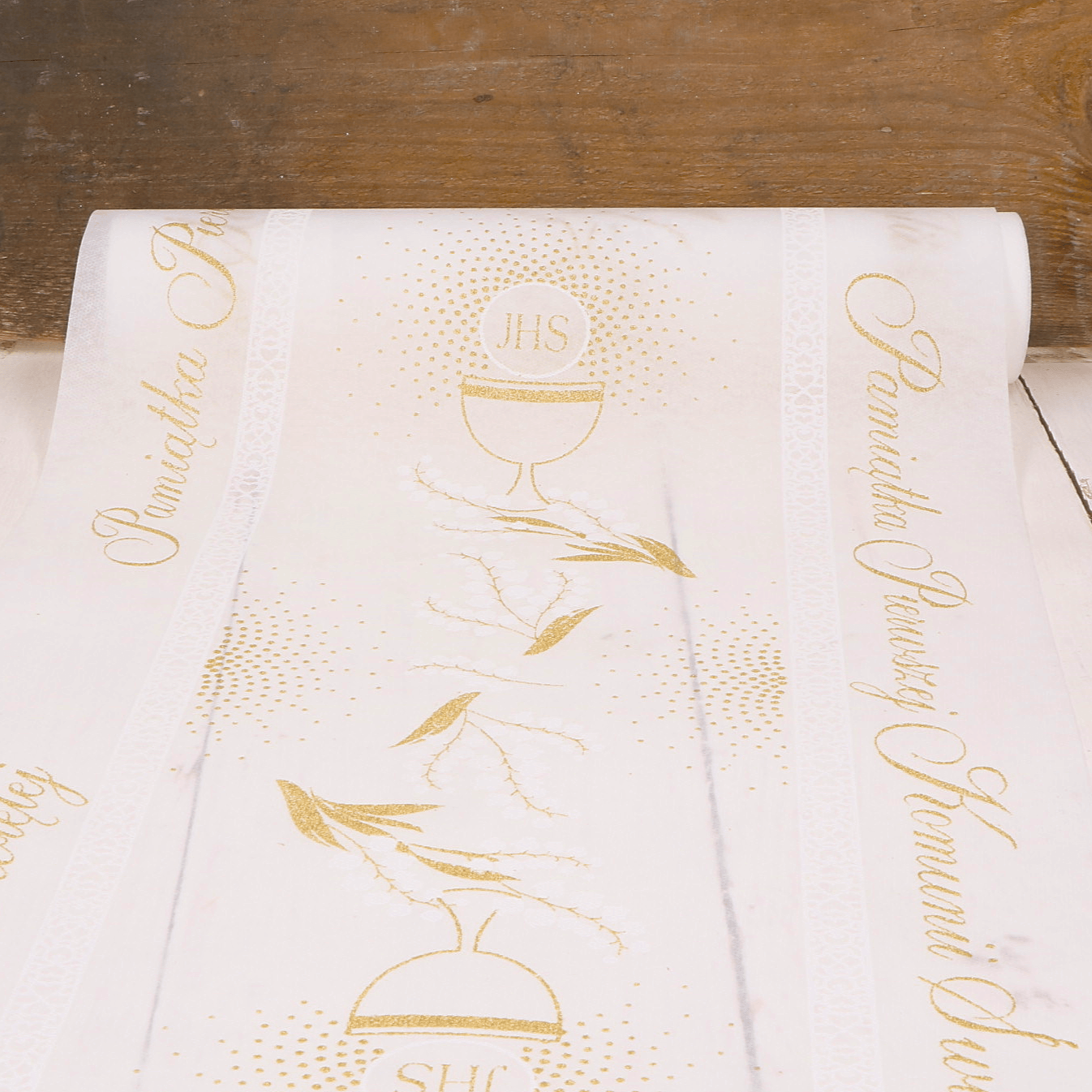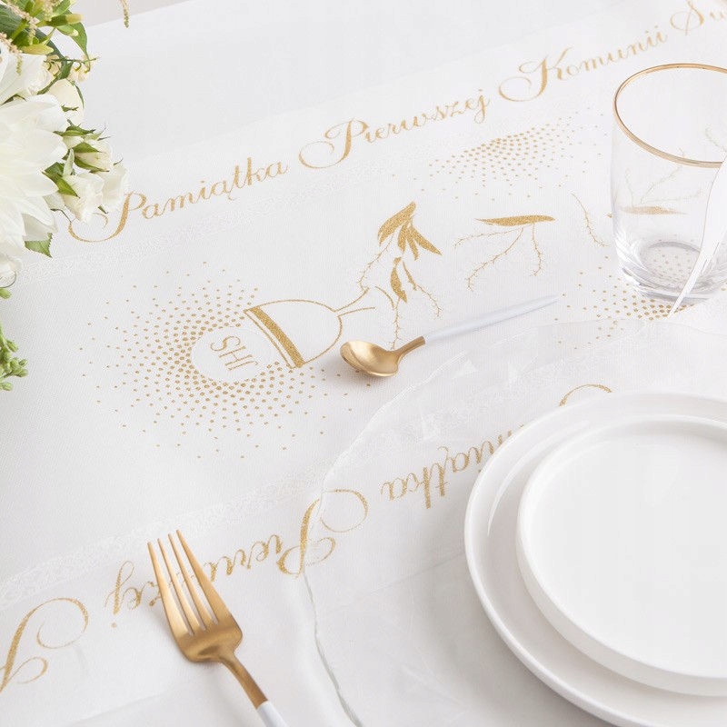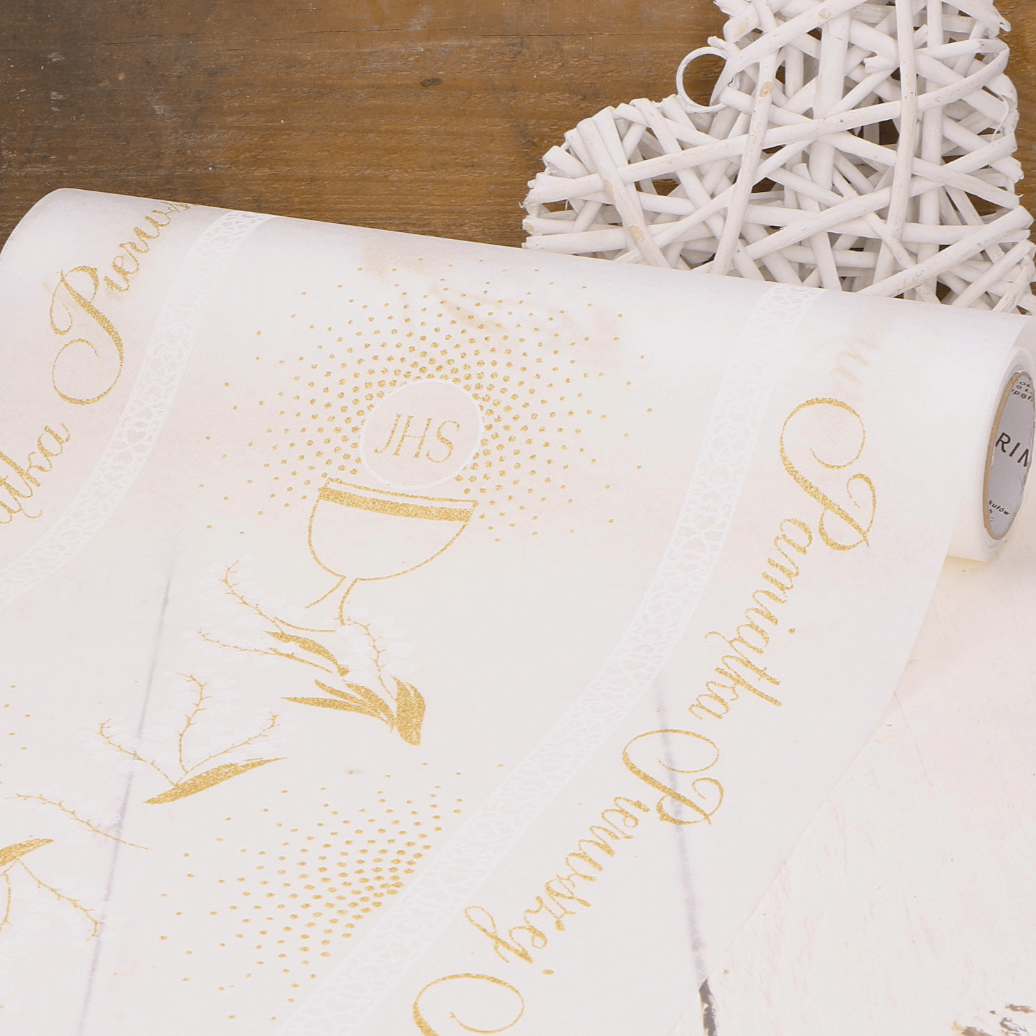 Bieżnik wykonany z flizeliny z motywem komunijnym. Biało-złota kolorystyka oraz popularny motyw opłatka i hostii oczaruje najbliższych i pozwoli stworzyć bazę do przygotowania całej aranżacji na Komunii dziecka. Bieżnik przygotowany specjalnie na Komunię to wyjątkowa dekoracja stołu.