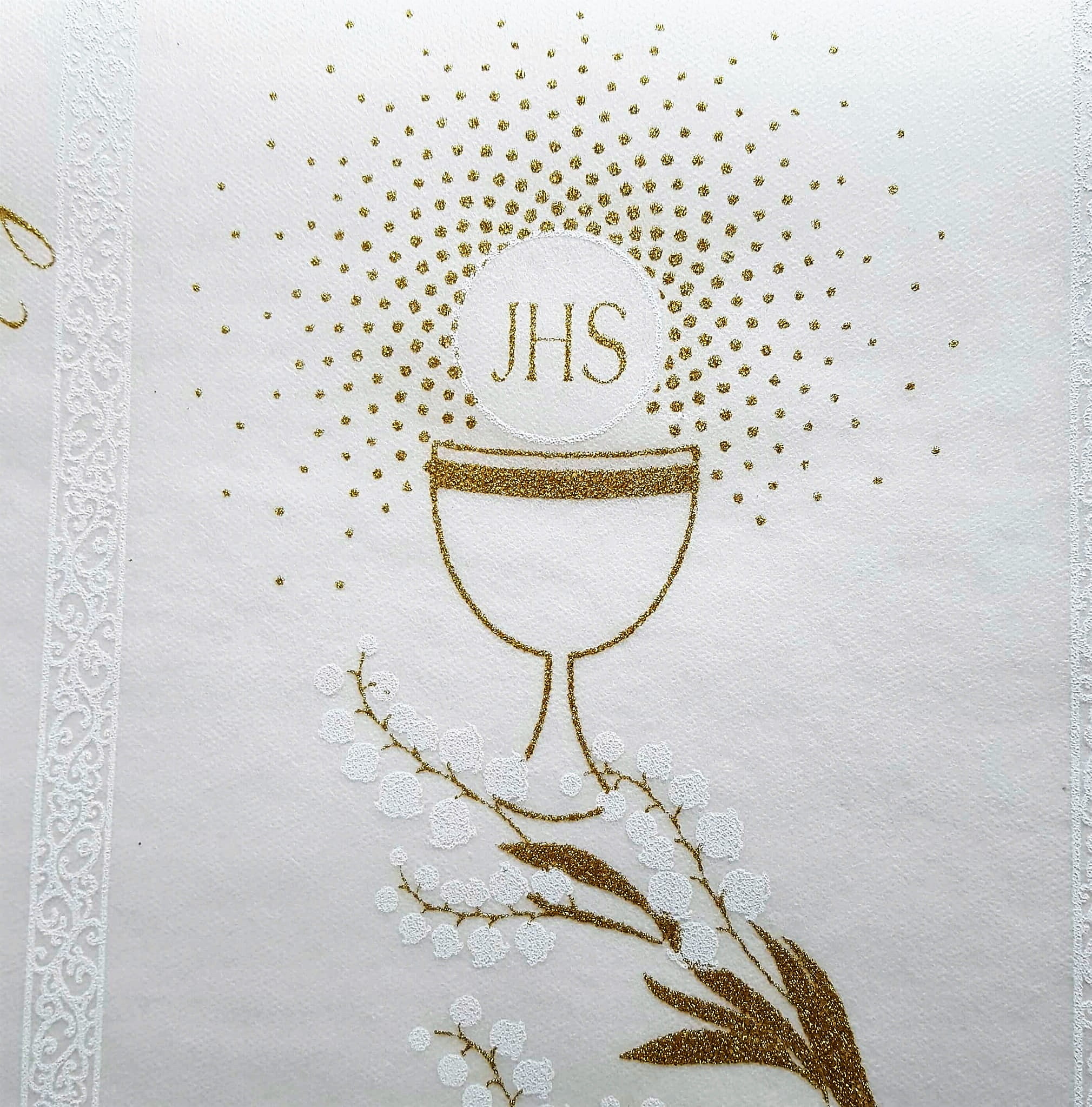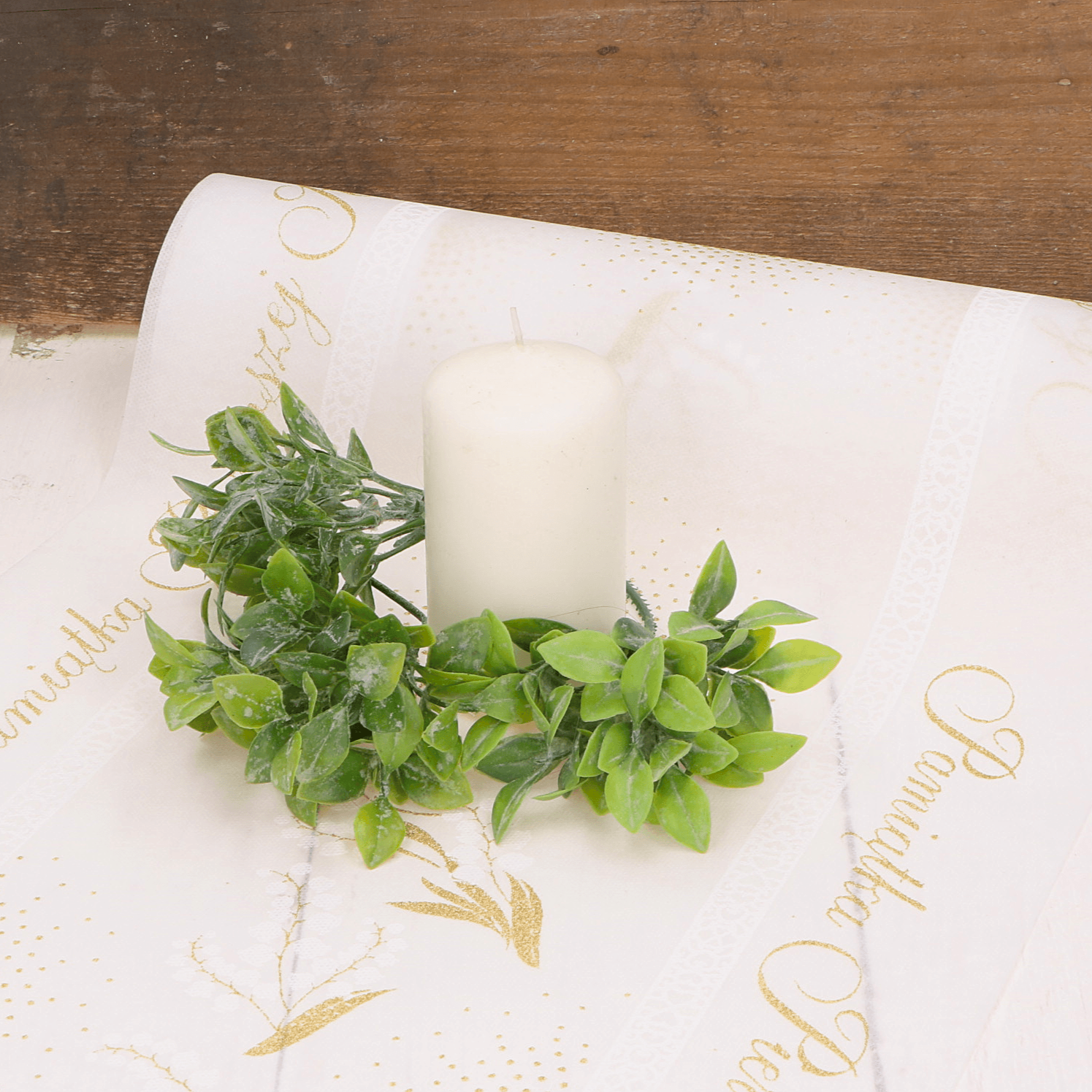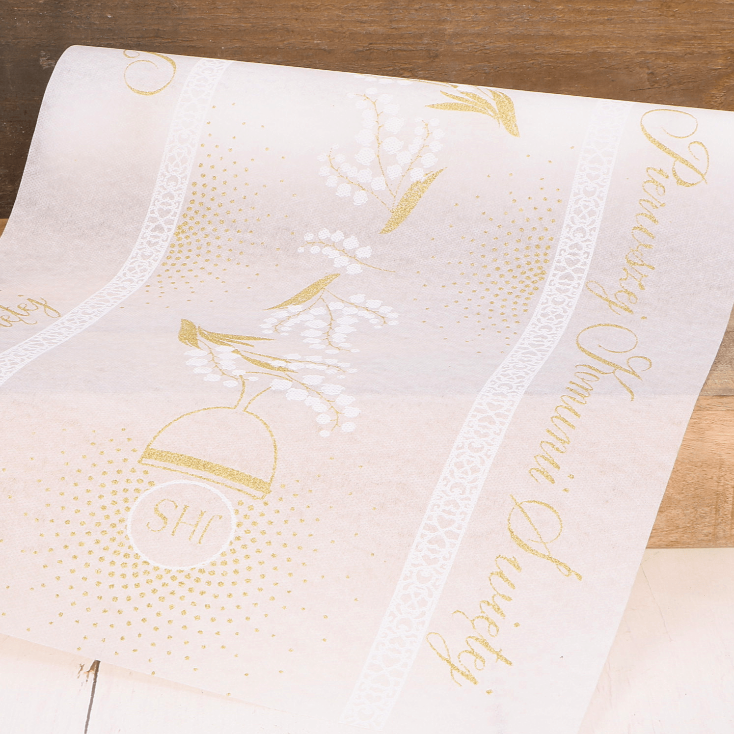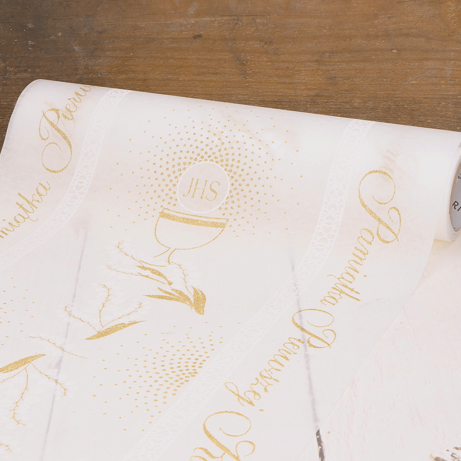Bieżnik wykonany z flizeliny z motywem komunijnym. Biało-złota kolorystyka oraz popularny motyw opłatka i hostii oczaruje najbliższych i pozwoli stworzyć bazę do przygotowania całej aranżacji na Komunii dziecka. Bieżnik przygotowany specjalnie na Komunię to wyjątkowa dekoracja stołu.