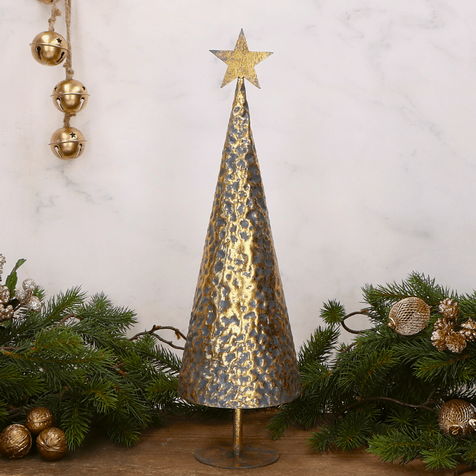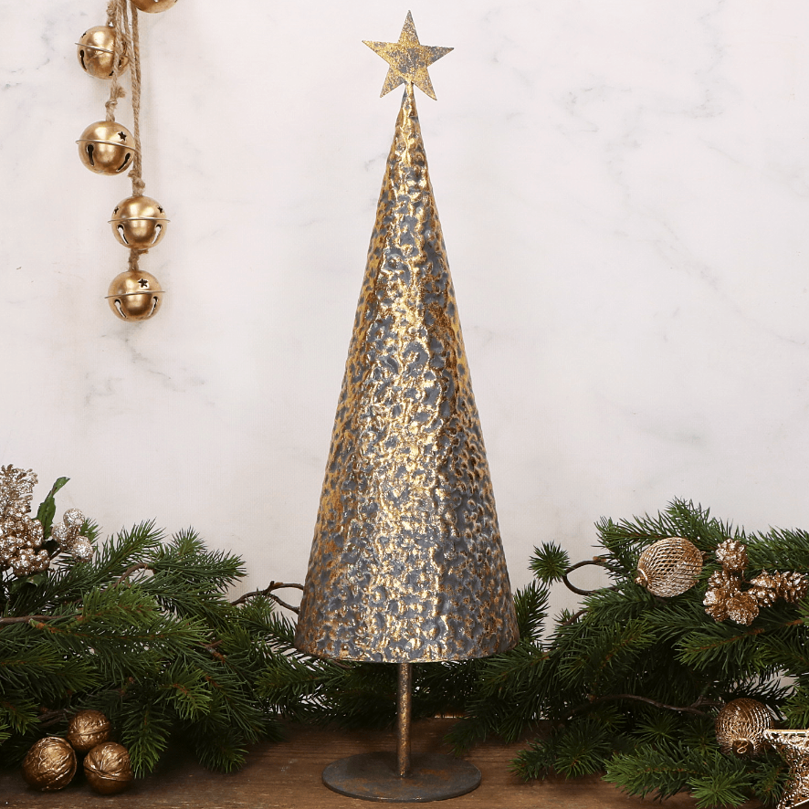 Piękna choinka świąteczna metalowa w złotym kolorze to wyjątkowa ozdoba, która idealnie podkreśli świąteczny klimat w każdym wnętrzu. Jej elegancki wygląd sprawia, że pasuje zarówno do klasycznych, jak i nowoczesnych aranżacji. Wykonana z trwałego metalu, zachwyca swoim połyskiem i subtelnym, postarzałym efektem, który nadaje jej unikalny charakter. Gwiazda umieszczona na szczycie dodaje całości uroku i sprawia, że choinka prezentuje się niezwykle efektownie. Dzięki stabilnej podstawie dekoracja może zostać ustawiona na stole, komodzie czy parapecie, tworząc niepowtarzalny klimat Bożego Narodzenia. To również doskonały pomysł na prezent dla bliskich.