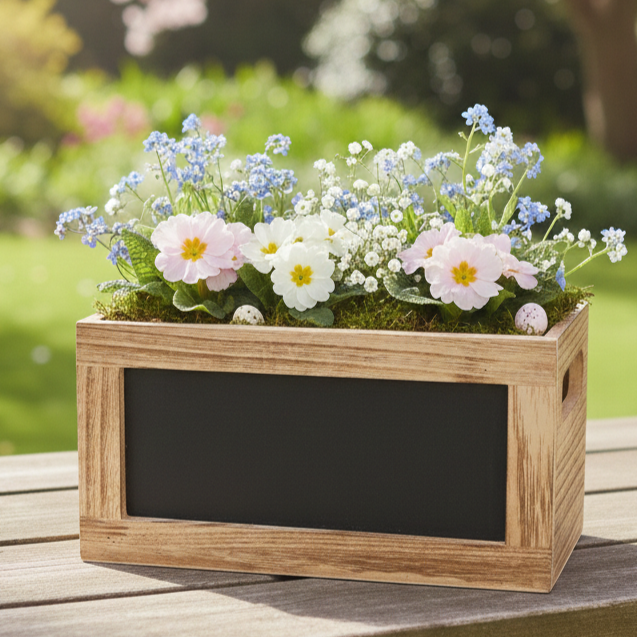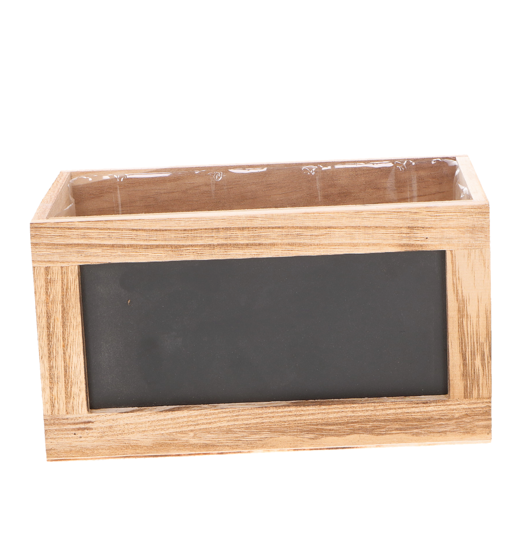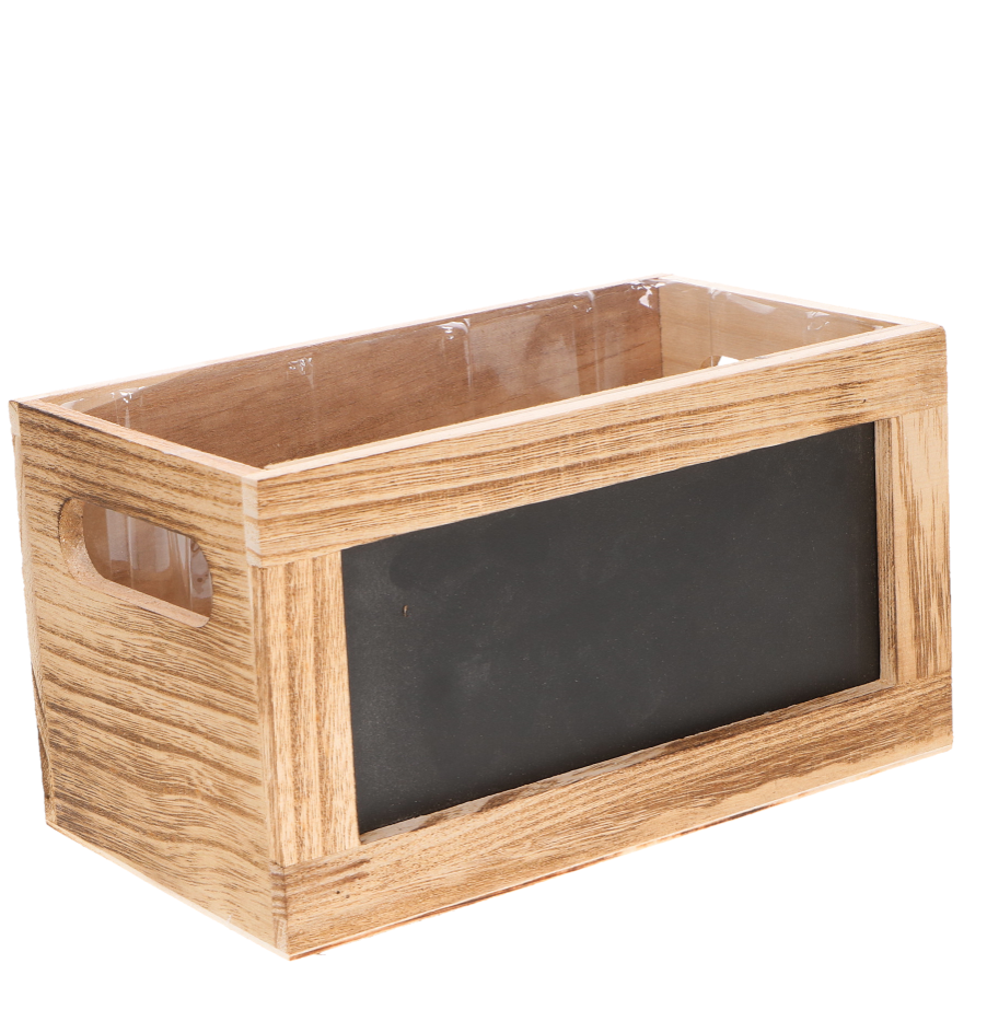 Wnętrze skrzynki zostało wyłożone transparentną osłonką, która zabezpiecza przed wilgocią i zabrudzeniami, dzięki czemu idealnie nadaje się do kompozycji kwiatowych, roślinnych oraz dekoracji sezonowych. Świetnie sprawdzi się w florystyce, dekoracjach wnętrz, a także jako baza do upominków i zestawów prezentowych.