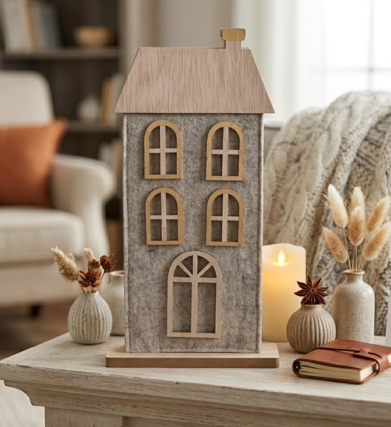 Elegancki domek filcowy w kolorze beżowym to wyjątkowa ozdoba świąteczna, która wniesie ciepło i styl do Twojego domu. Domek jest starannie wykonany, z okienkami w złotych ramach, co nadaje mu elegancki wygląd. Solidna podstawa zapewnia stabilność, dzięki czemu można go postawić na kominku, stole czy parapecie. Ten filcowy domek to doskonały element dekoracyjny, który doda uroku każdemu wnętrzu podczas świąt. Idealny również jako prezent dla bliskich, który wprowadzi magiczny nastrój do ich domu.