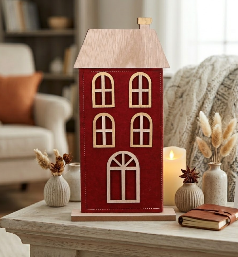 Elegancki domek filcowy w kolorze boordowym to wyjątkowa ozdoba świąteczna, która wniesie ciepło i styl do Twojego domu. Domek jest starannie wykonany, z okienkami w złotych ramach, co nadaje mu elegancki wygląd. Solidna podstawa zapewnia stabilność, dzięki czemu można go postawić na kominku, stole czy parapecie. Ten filcowy domek to doskonały element dekoracyjny, który doda uroku każdemu wnętrzu podczas świąt. Idealny również jako prezent dla bliskich, który wprowadzi magiczny nastrój do ich domu.