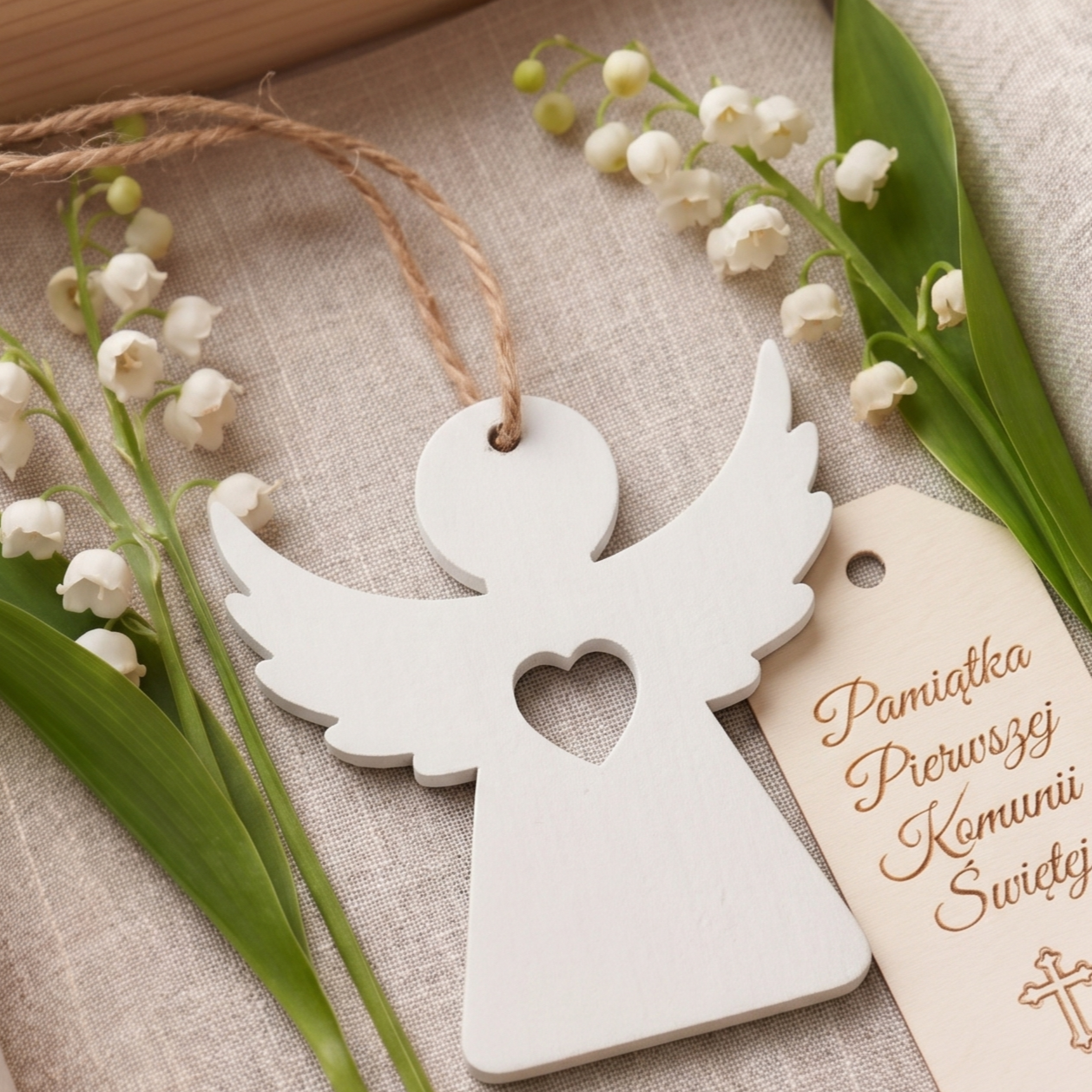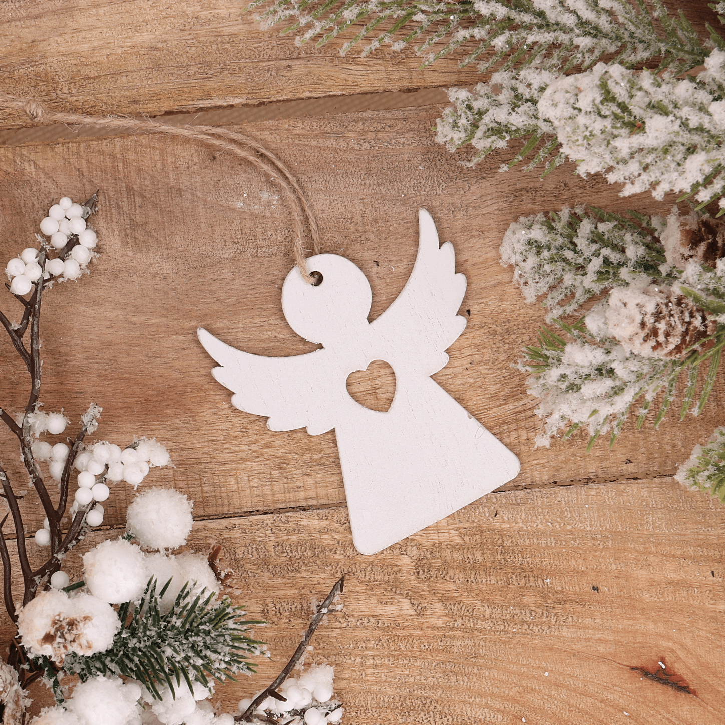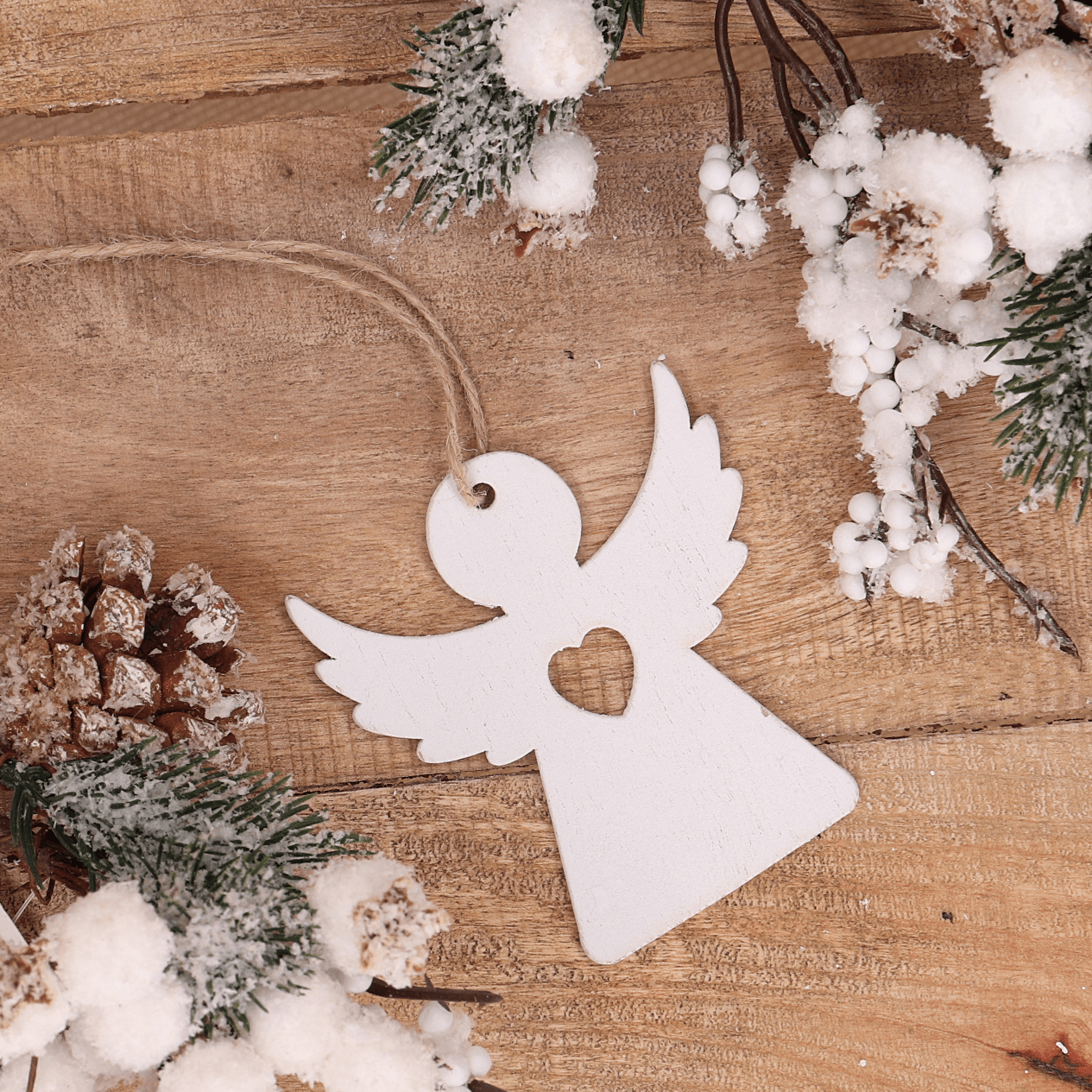 Piękna drewniana zawieszka w kształcie aniołka z serduszkiem to idealny akcent do świątecznych dekoracji. Wykonana z naturalnego drewna w białym kolorze, z wyciętym detalem serca na środku, wprowadza do wnętrza ciepło i symbolikę miłości oraz opieki. Dzięki jutowemu sznurkowi o długości 10 cm, zawieszkę można z łatwością umieścić na choince, gałązkach, stroikach lub prezentach. Doskonale wpisuje się w styl skandynawski, rustykalny i klasyczny, sprawiając, że każda dekoracja nabiera wyjątkowego charakteru.
