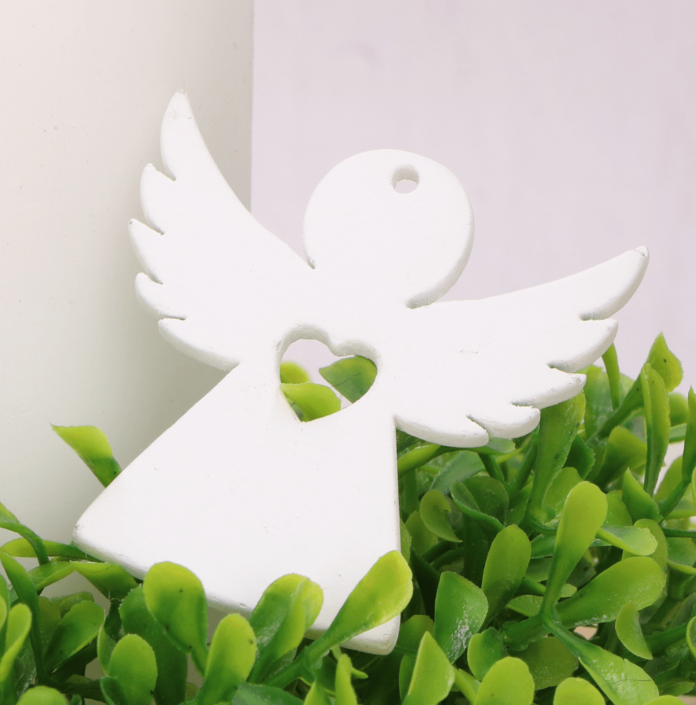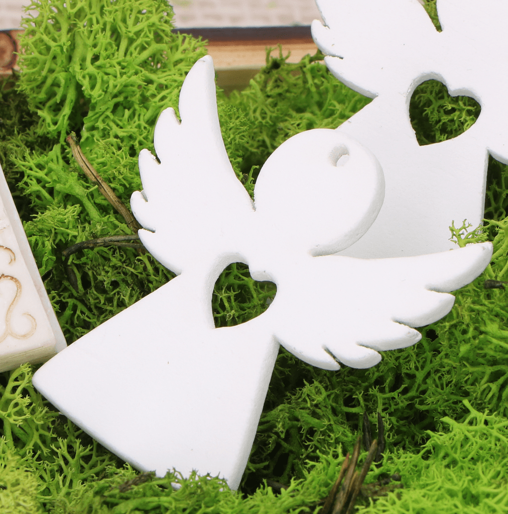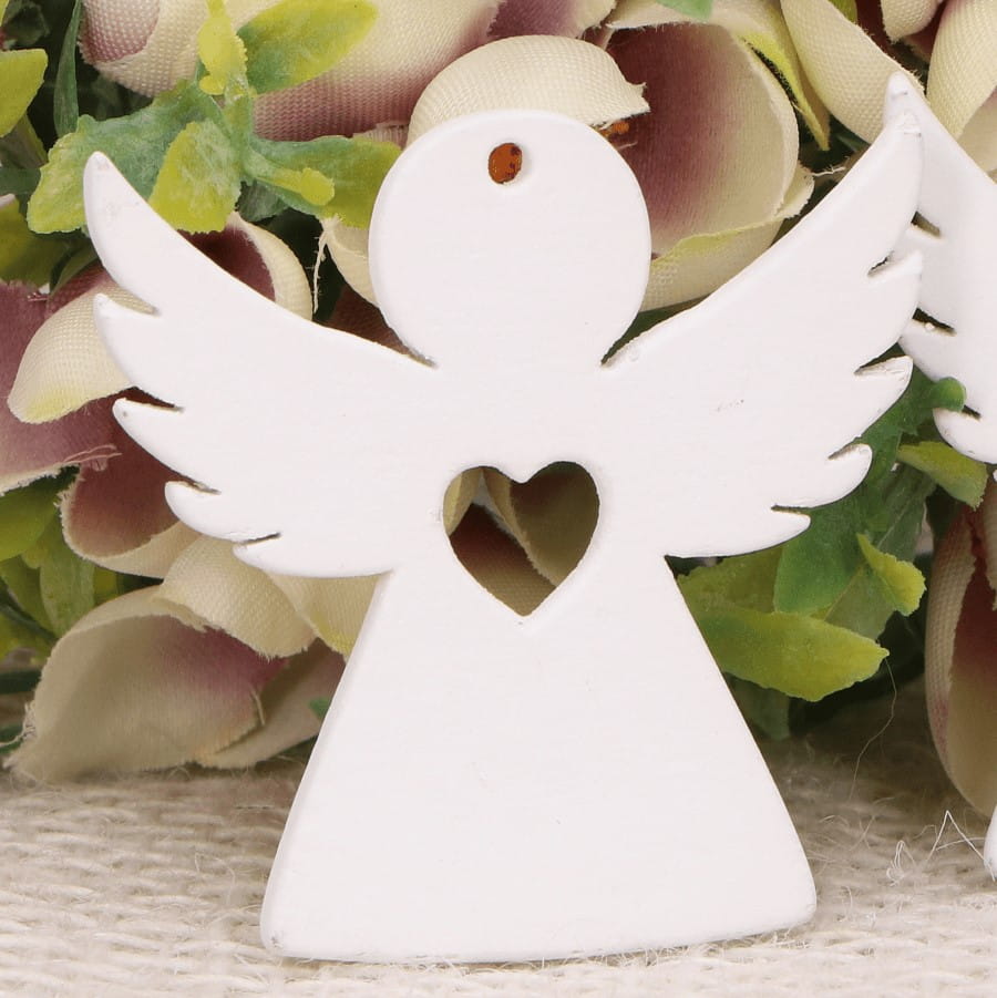 - Ręcznie wykonany, pomalowany na biało aniołek z wyciętym sercem