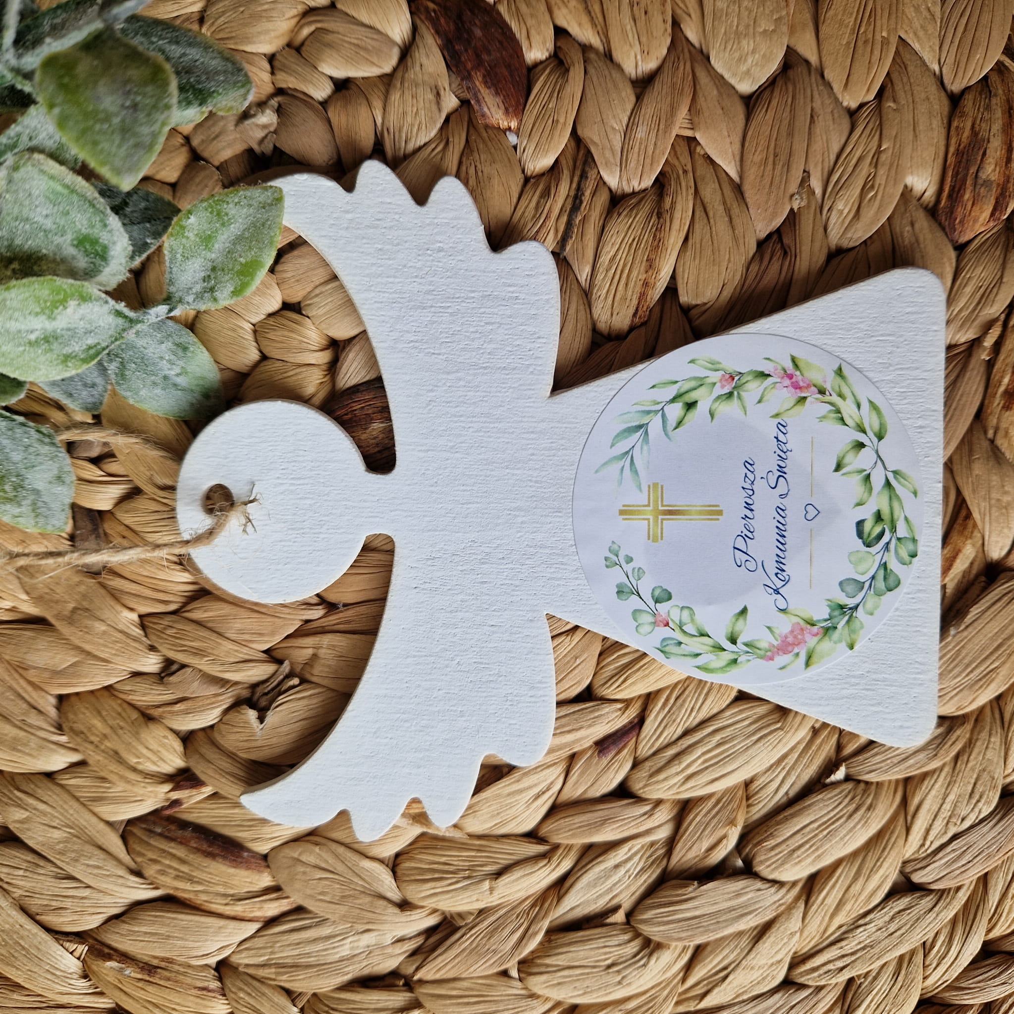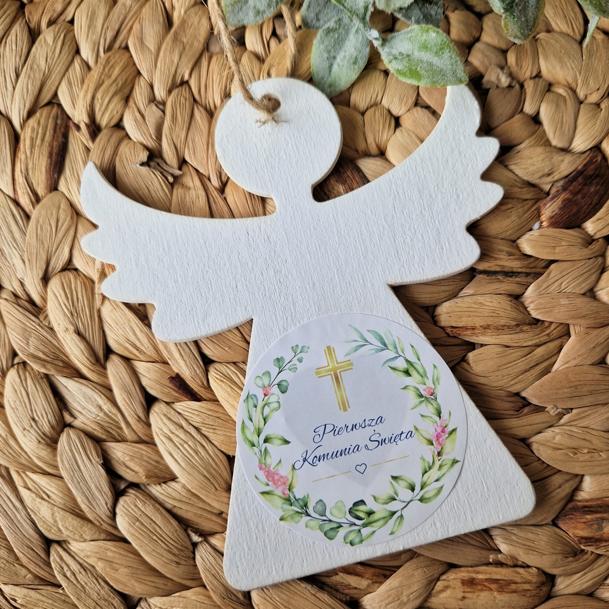 Drewniany Aniołek z naklejką z okazji Pierwszej Komunii Świętej. Idealnie sprawdzi się jako dodatek do prezentu i zostanie pamiątka na lata.