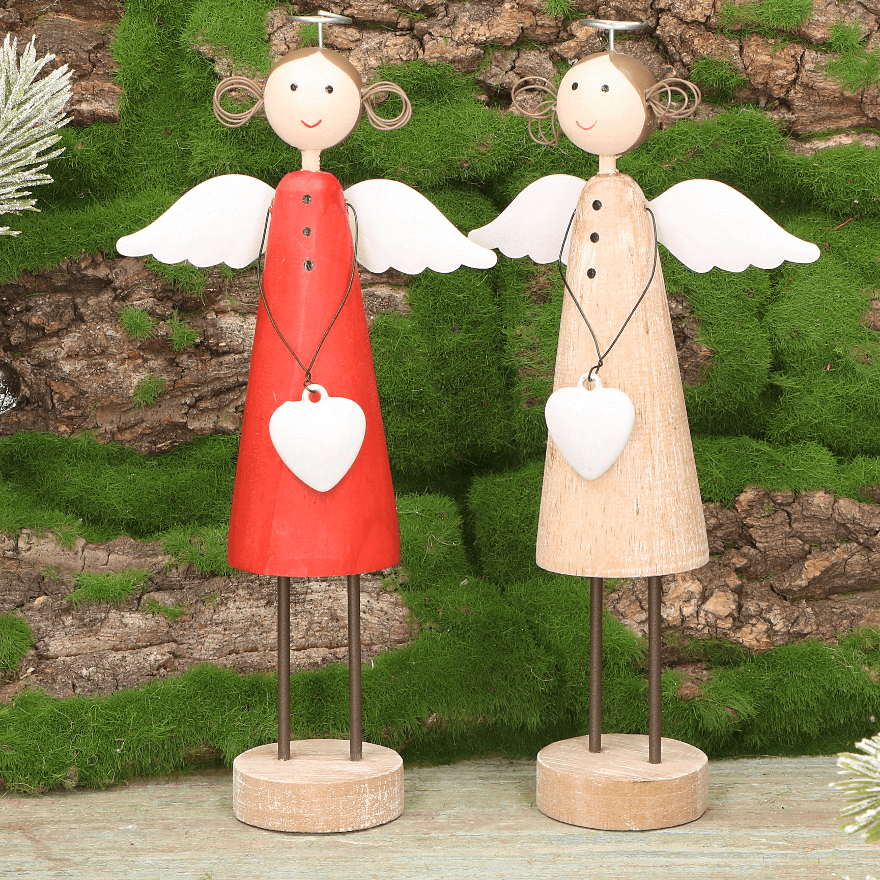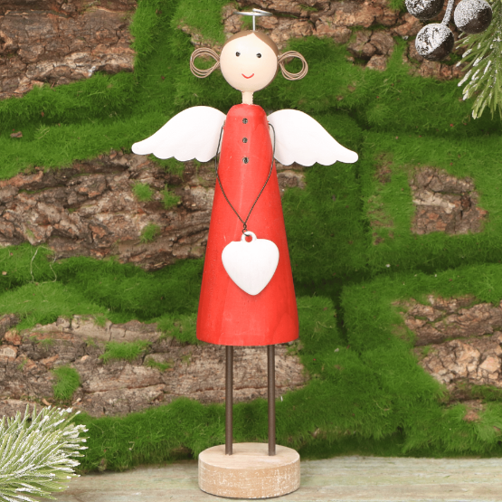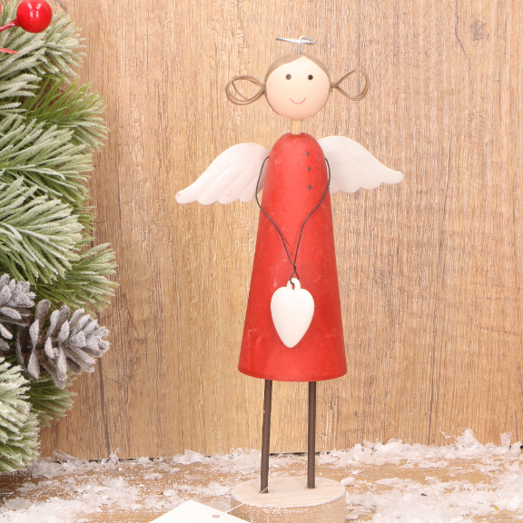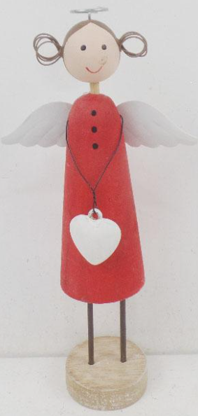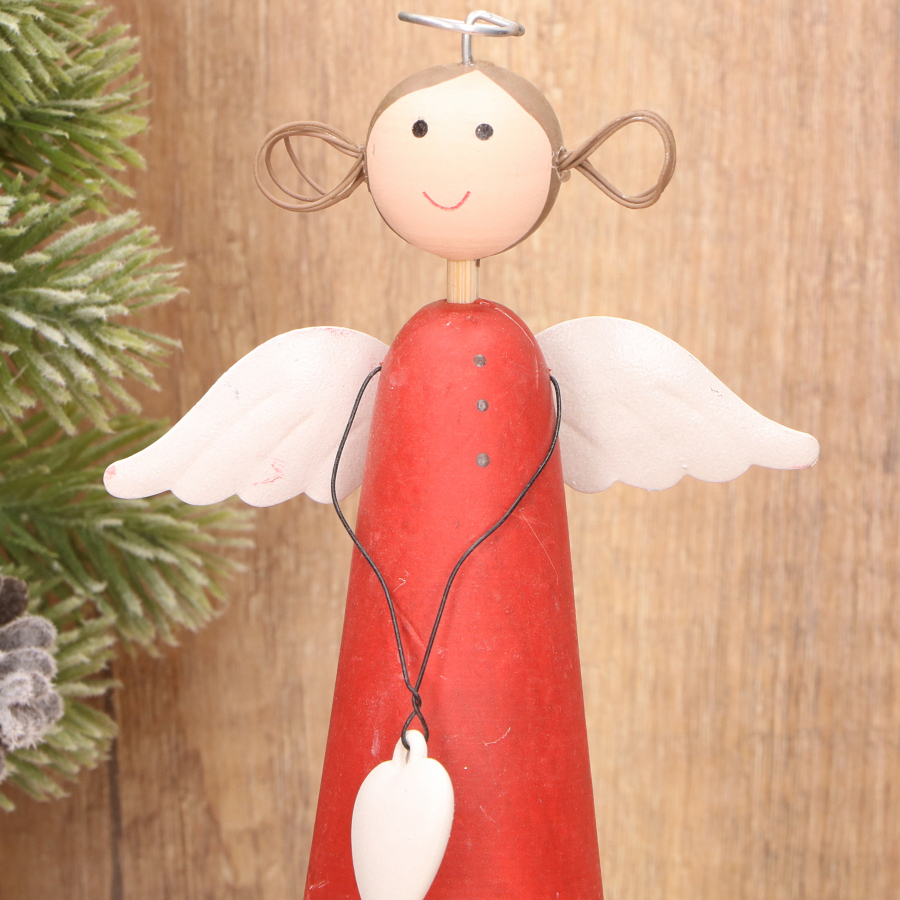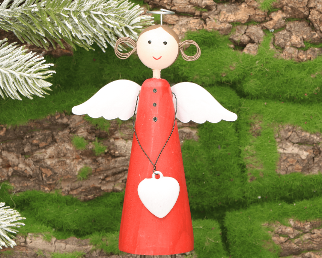 Drewniany aniołek dekoracyjny w czerwonej sukience - 19 cm