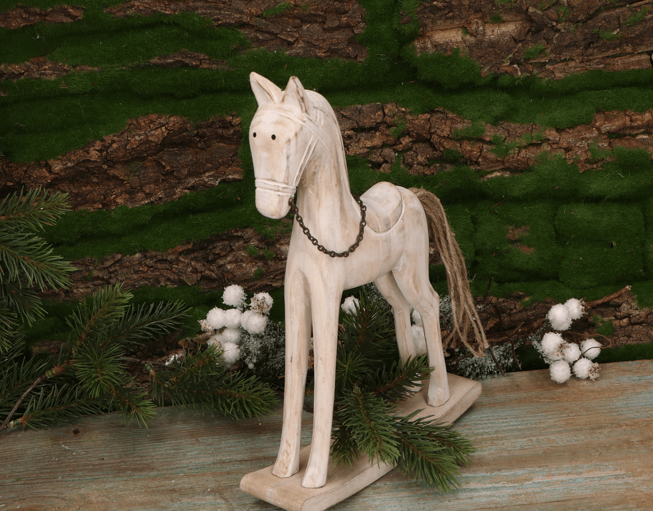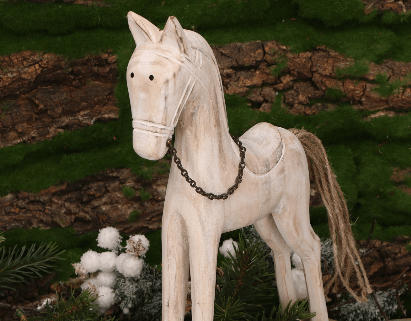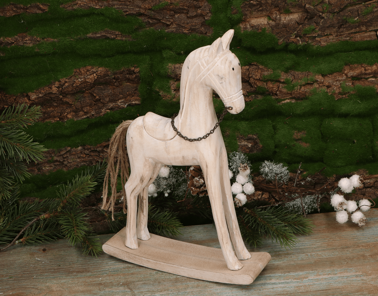 Uroczy drewniany koń na biegunach to dekoracja w stylu vintage, która wniesie do wnętrza nutę nostalgii i świątecznego uroku. Wykonany z naturalnego drewna, z dbałością o detale – posiada siodło, łańcuszek jako uzdę oraz ogon z jutowego sznurka, co nadaje mu autentyczny i rękodzielniczy charakter. Doskonale sprawdzi się jako ozdoba świąteczna, element dekoracji dziecięcego pokoju, a także jako nietuzinkowy dodatek do rustykalnych i klasycznych aranżacji. Staranne wykonanie i ciepła kolorystyka sprawiają, że koń przyciąga uwagę i budzi miłe skojarzenia z dzieciństwem. To również doskonały pomysł na oryginalny prezent.