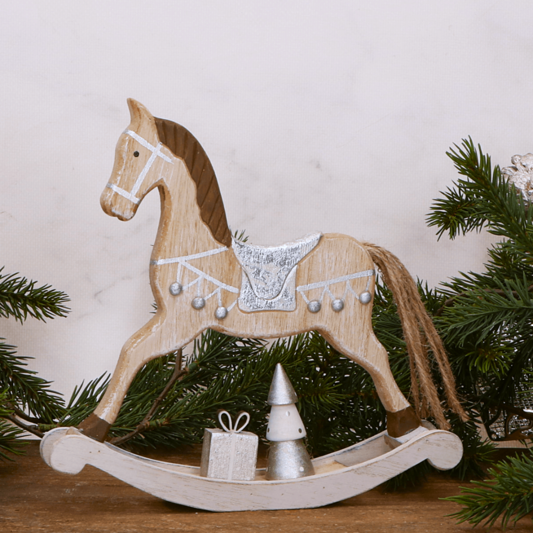 Drewniany konik na biegunach ze srebrnymi dodatkami 19,5x18,5x3,5cm