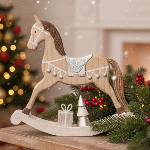 Uroczy drewniany konik na biegunach to doskonała świąteczna dekoracja, która wniesie do wnętrza ciepłą, nostalgiczną atmosferę. Wykonany z drewna, ozdobiony jest srebrnymi detalami, takimi jak siodło i subtelne ozdoby, co nadaje mu elegancji i świątecznego blasku. Konik na biegunach, symbolizujący radość i beztroskę, idealnie sprawdzi się jako ozdoba stołu, kominka lub parapetu. Styl retro łączy się tutaj z nowoczesnym wykonaniem, co czyni ten produkt idealnym dodatkiem do tradycyjnych i nowoczesnych wnętrz.