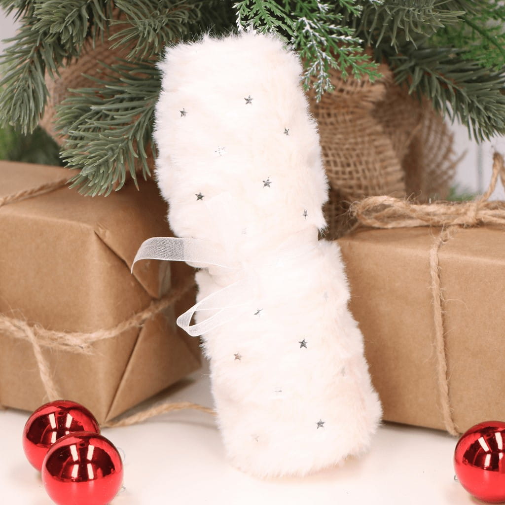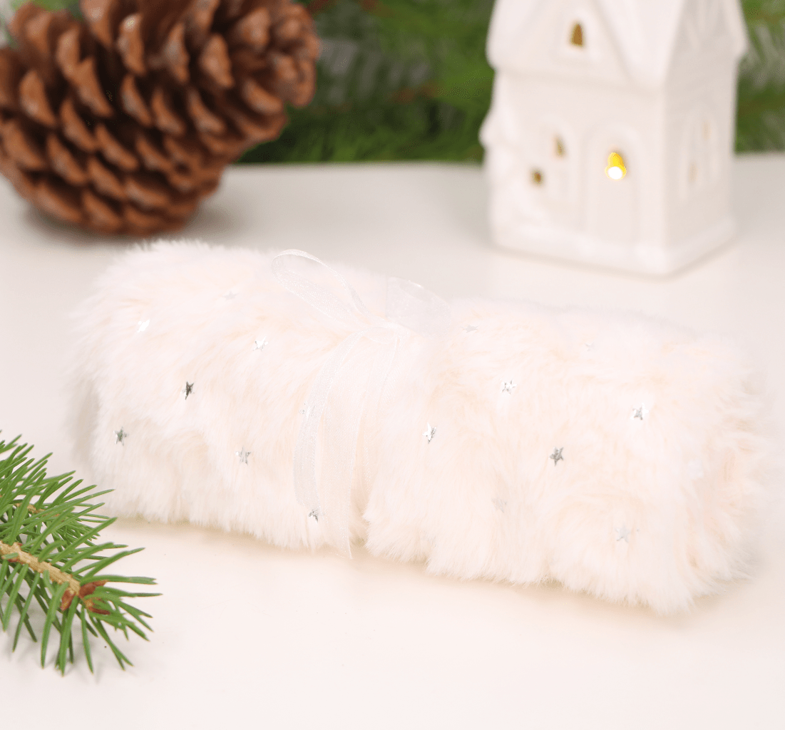 Świetnym pomysłem na świąteczną aranżację, która oczaruje wszystkich gości będzie aksamitny futerkowy bieżnik pokryty srebrnymi gwiazdkami. Bieżnik to idealny pomysł na prezent, ponieważ jest związany elegancką wstążeczką i gotowy do wręczenia.