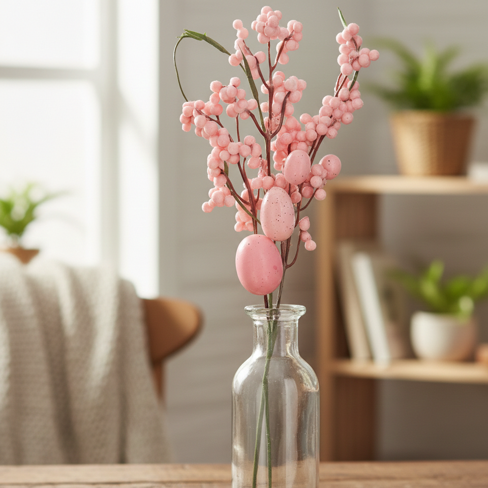 Stylowa gałązka wielkanocna w kolorze różowym to subtelna i elegancka ozdoba, idealna do tworzenia świątecznych kompozycji. Delikatne kuleczki oraz dekoracyjne jajeczka nadają jej wiosennego charakteru i doskonale podkreślają wielkanocny klimat.
