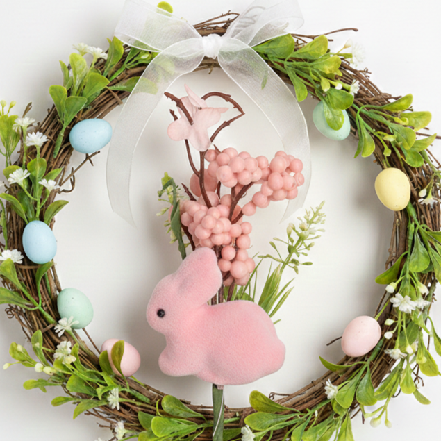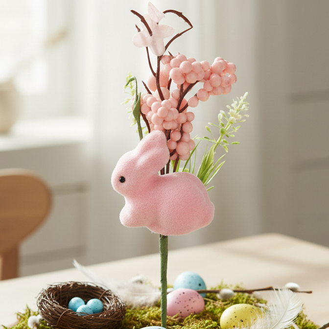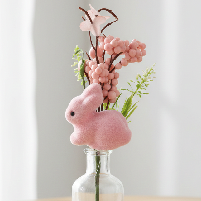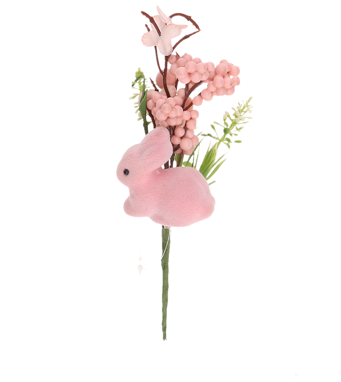 Miękki, flokowany zajączek w pastelowym odcieniu różu w połączeniu z dekoracyjnymi kuleczkami i gałązkami tworzy gotową kompozycję idealną do stroików i świątecznych aranżacji.