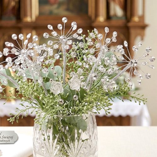 Urocze i delikatne kryształki na druciku będą doskonałym dodatkiem do wystroju sali weselnej, komunijnej, na chrzest, jak również w aranżacjach domowego zacisza.