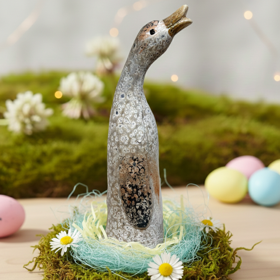 Ta wyjątkowa gęś ceramiczna w kremowo-beżowym kolorze to oryginalna ozdoba, która doda uroku każdej wielkanocnej aranżacji. Jej wysmukła forma z uniesionym dziobem przyciąga uwagę i nadaje całości eleganckiego charakteru. Dekoracja wykonana jest z ceramiki o postarzanej strukturze, co nadaje jej rustykalny, naturalny wygląd – idealny do wnętrz urządzonych w stylu boho, vintage lub country. Gęś sprawdzi się świetnie jako ozdoba stołu, komody czy parapetu. Jej neutralna kolorystyka harmonizuje z innymi elementami wystroju, wprowadzając spokój i przytulność. To także świetny pomysł na oryginalny prezent z okazji świąt.