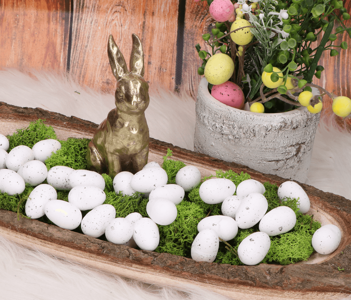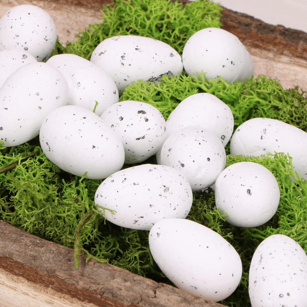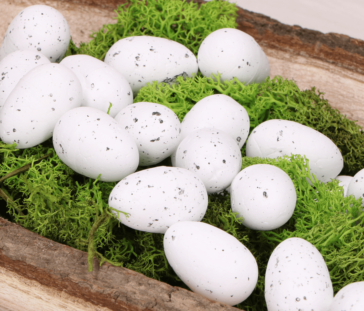 Wiosna i Wielkanoc zbliżają się wielkimi krokami. Aby wnieść do wnętrza świątecznego klimatu, możesz stworzyć różne kompozycje DIY z jajeczkami przepiórczymi. Jajeczka będą pięknie wyglądać wśród mchu, tulipanów i innych kwiatów. Nakrapiane jajeczka wyglądają pięknie w towarzystwie innych dekoracji Wielkanocnych i dodają wiele uroku do każdej kompozycji świątecznej. Jajeczka styropianowe bezpieczne są również dla dzieci, ponieważ nie potłuką się w razie upadku.