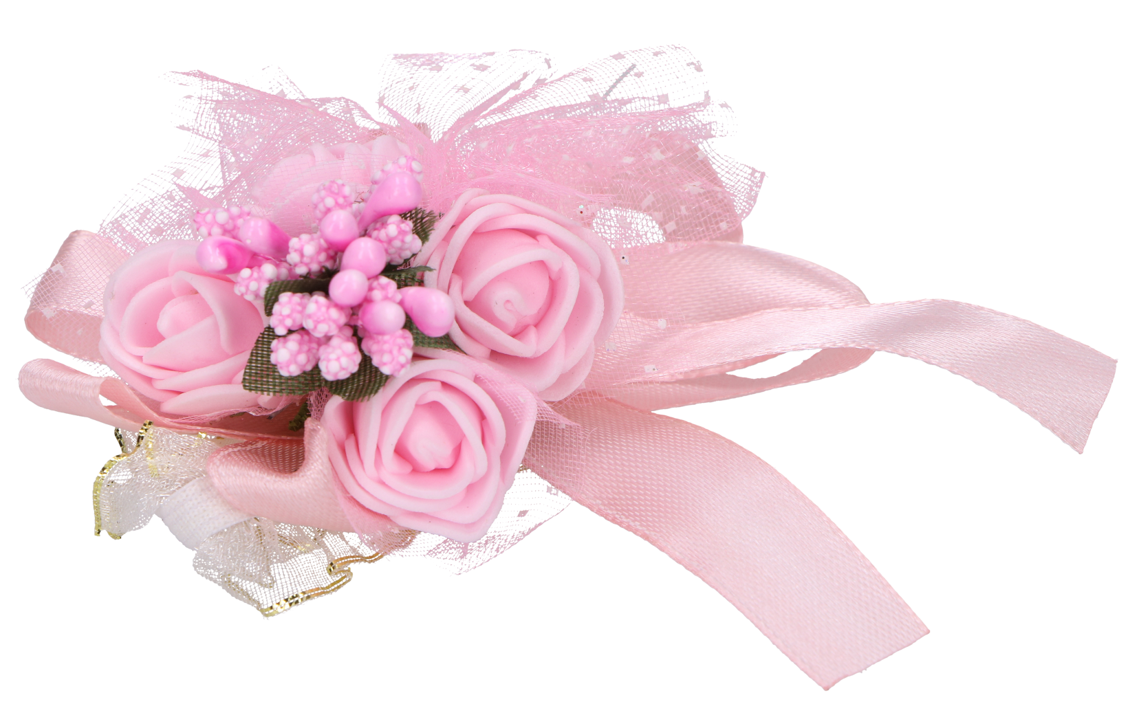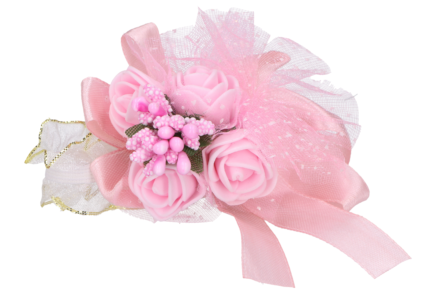 • Niezwykłe bukieciki wykonane z różyczek, ryżyku, wstążeczek satynowych i szyfonowych oraz ozdobnych listków.