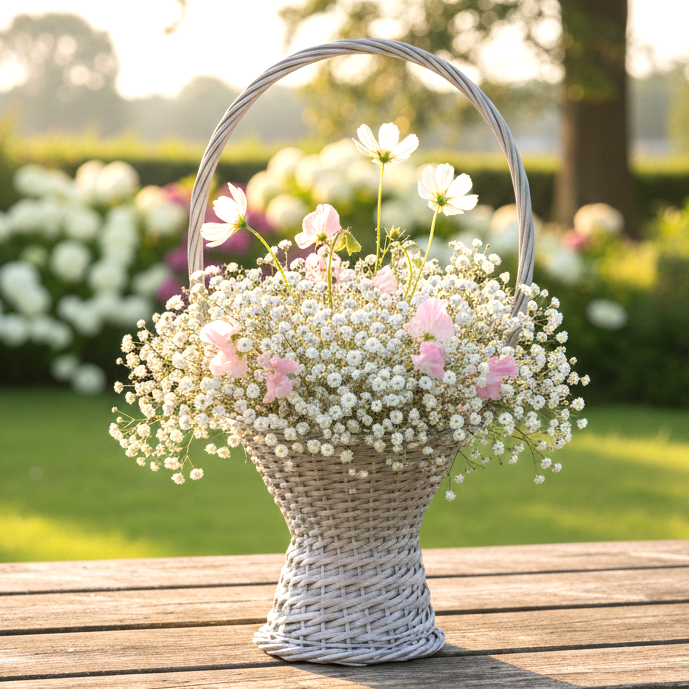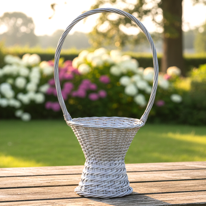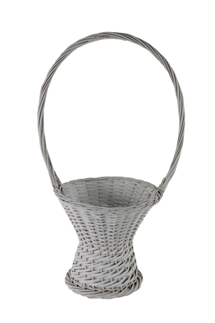 Elegancki koszyk wiklinowy o klasycznym kształcie i wysokiej rączce to stylowy dodatek do dekoracji wnętrz, tarasów, ogrodów oraz uroczystości takich jak śluby czy komunie. Wykonany z naturalnej wikliny, malowany na biało, wpisuje się w romantyczny i rustykalny klimat aranżacji. Świetnie sprawdzi się jako kosz na kwiaty, prezent, dekorację lub koszyczek dla druhny. Solidna konstrukcja i ręczne wykonanie gwarantują trwałość oraz unikalny wygląd każdego egzemplarza. Wysoka rączka ułatwia przenoszenie, a estetyczny wygląd sprawia, że kosz doskonale prezentuje się w każdej przestrzeni.