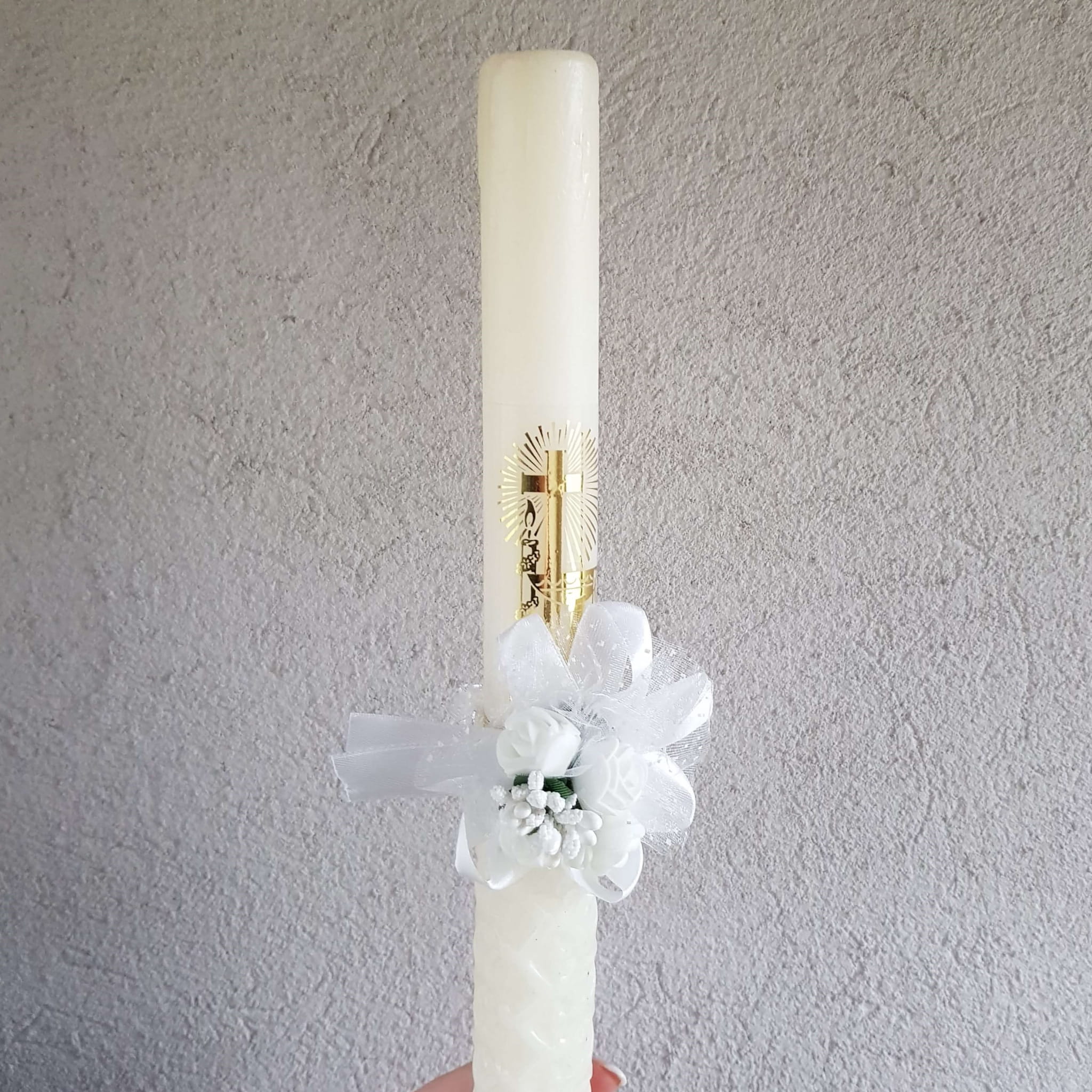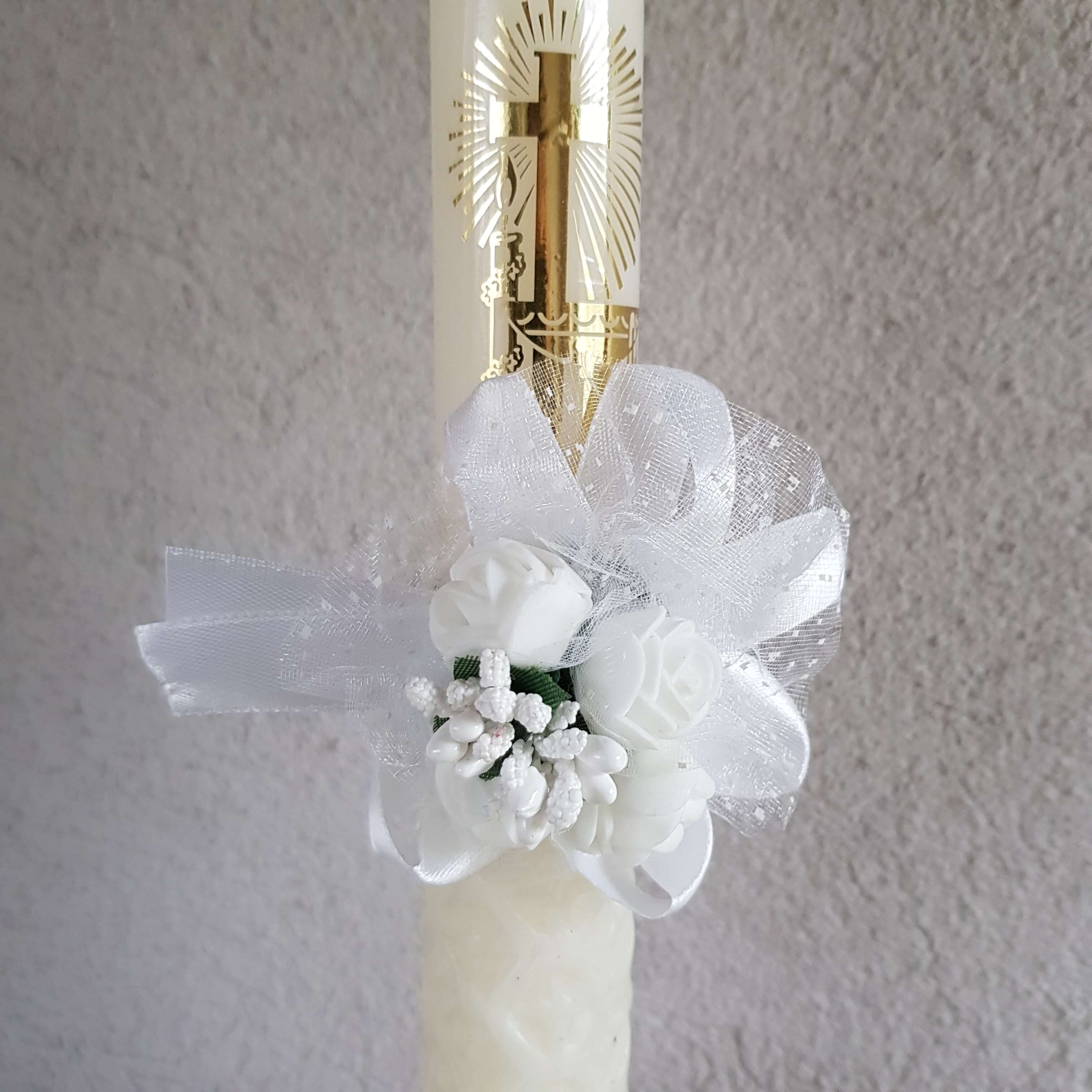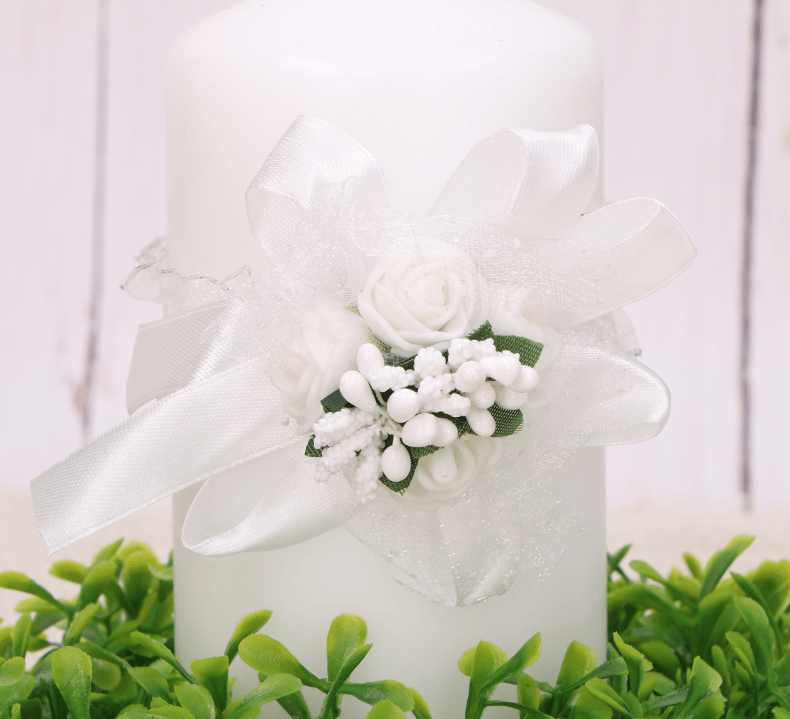 Efektowny stroik wykonany z małych różyczek zdobiony listkami, ryżykiem oraz przewiązany wstążeczką w kolorze dopasowanym do kwiatów, dzięki czemu kompozycja jest spójna. Uniwersalna dekoracja na komunię, może służyć jako stroik na rękę, do świecy, do dekoracji kościołów i sali komunijnych.