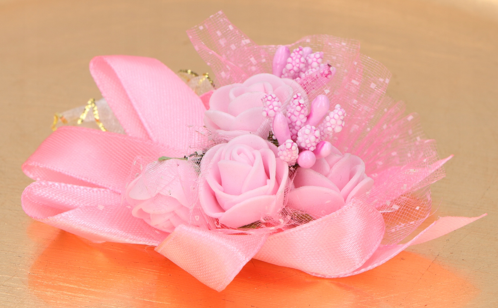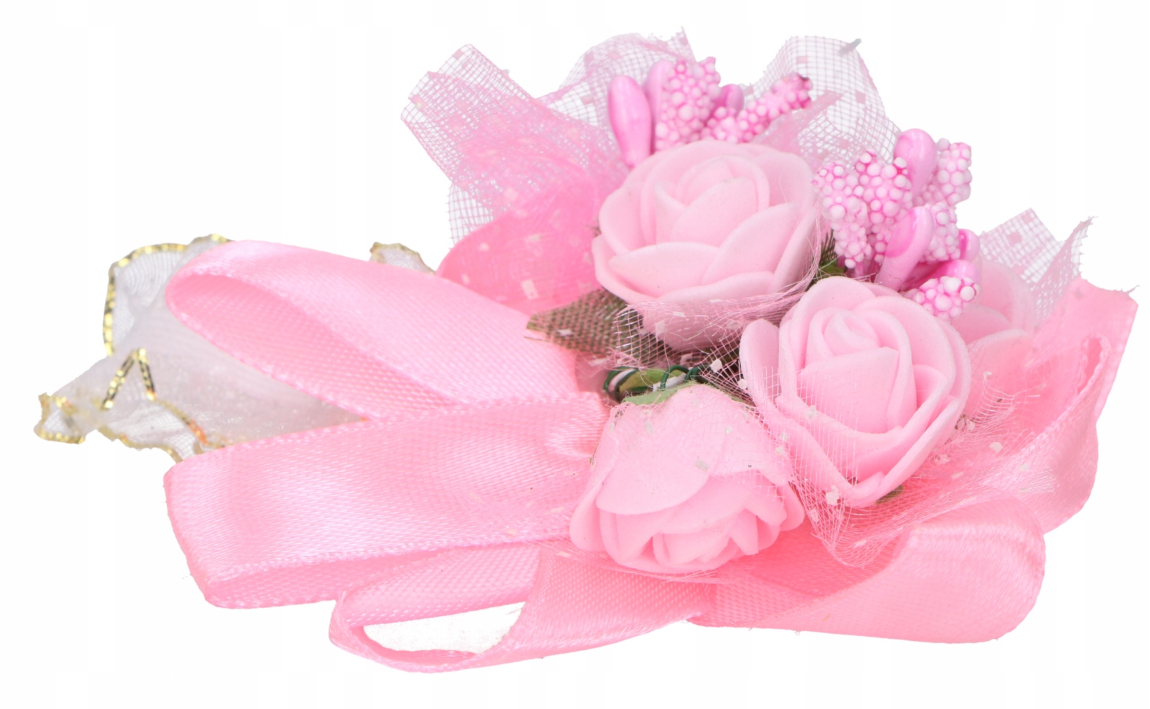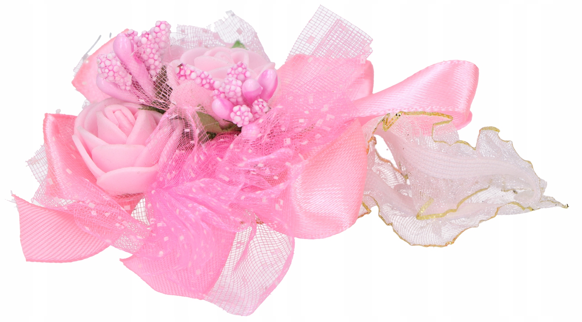 - Niezwykłe bukieciki wykonane z różyczek, ryżyku, wstążeczek satynowych i szyfonowych oraz ozdobnych listków.
