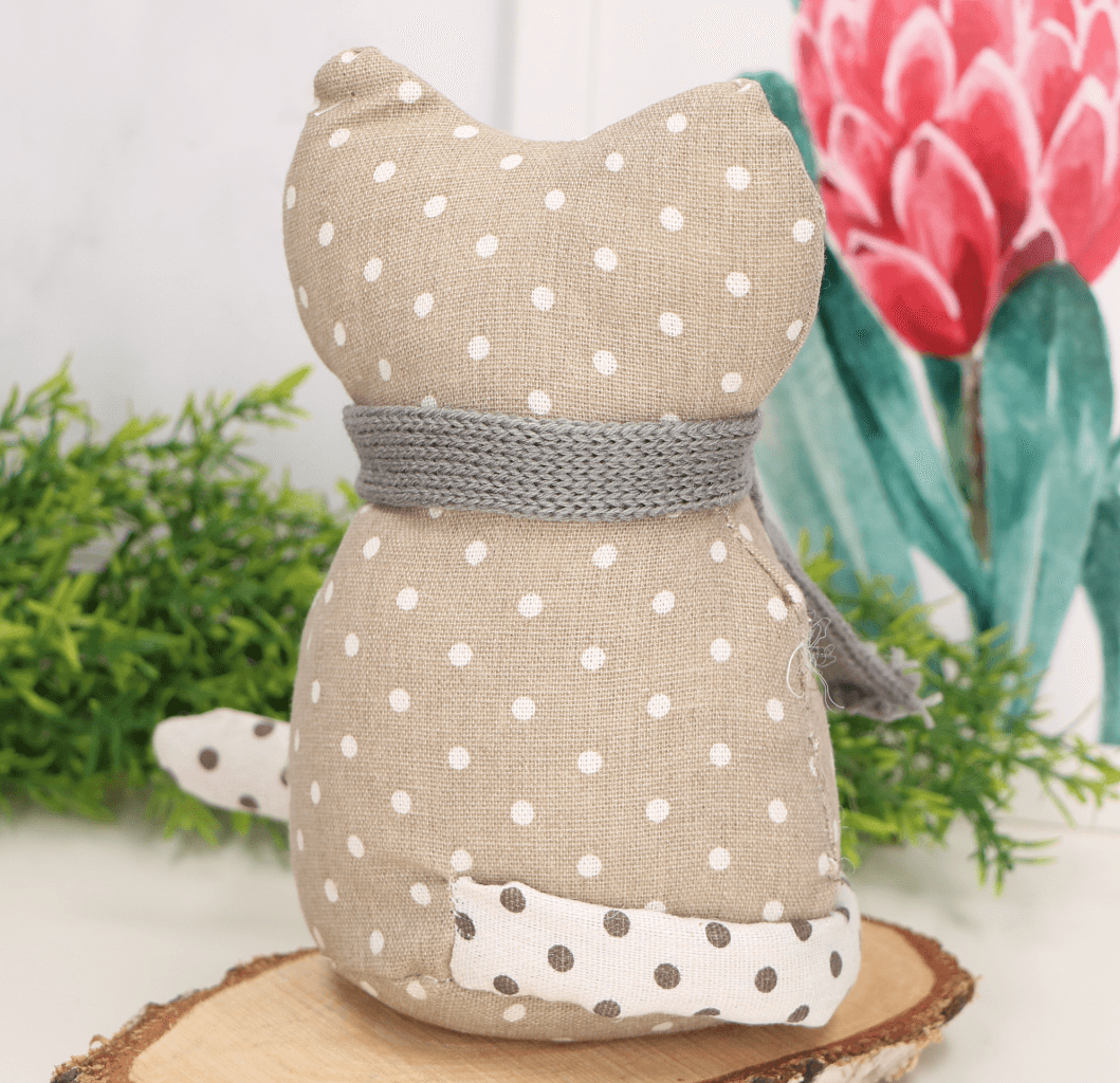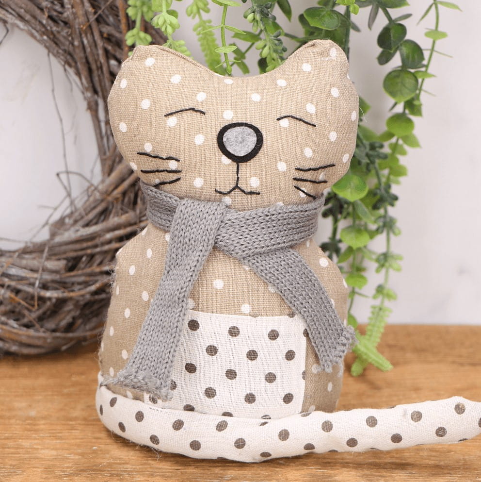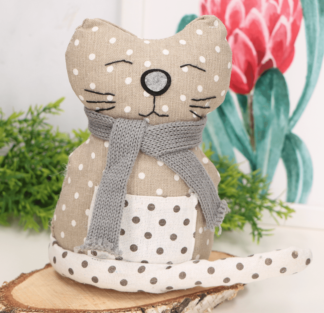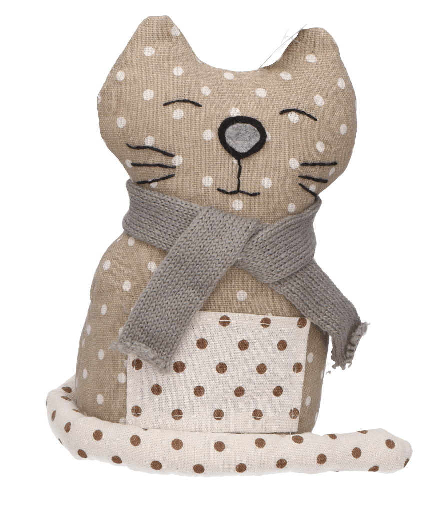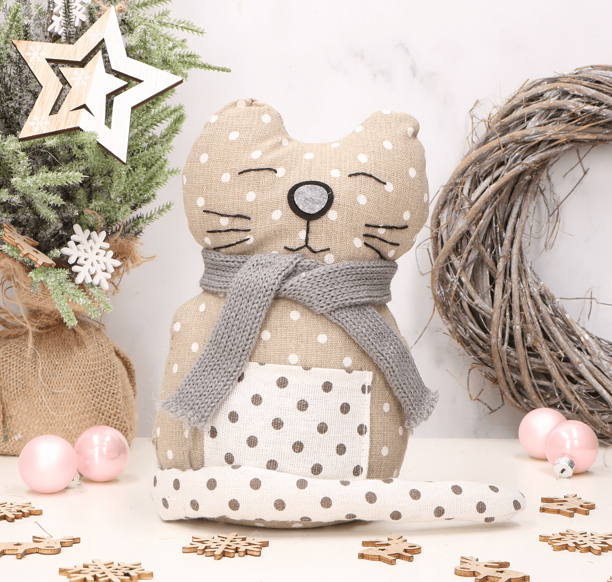 Kotek wykonany z materiału to uroczy element. Ten ozdobny kotek jest starannie wykonana z różnych tkanin i materiałów, które nadają jej miękkość i przyjemny wygląd.