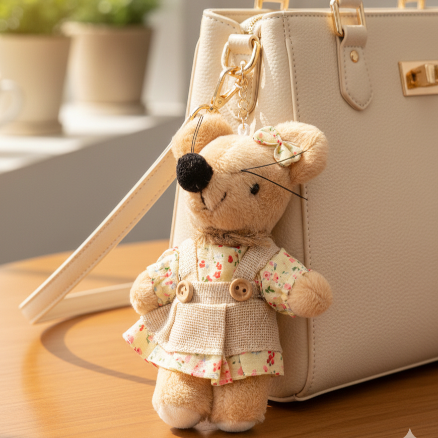 Urocza myszka dekoracyjna w formie breloka do kluczy to wyjątkowy dodatek, który łączy funkcjonalność z ozdobnym charakterem. Starannie wykonana, w dziewczęcej stylizacji z sukienką i kokardką, będzie piękną dekoracją torebki, plecaka lub kluczy.