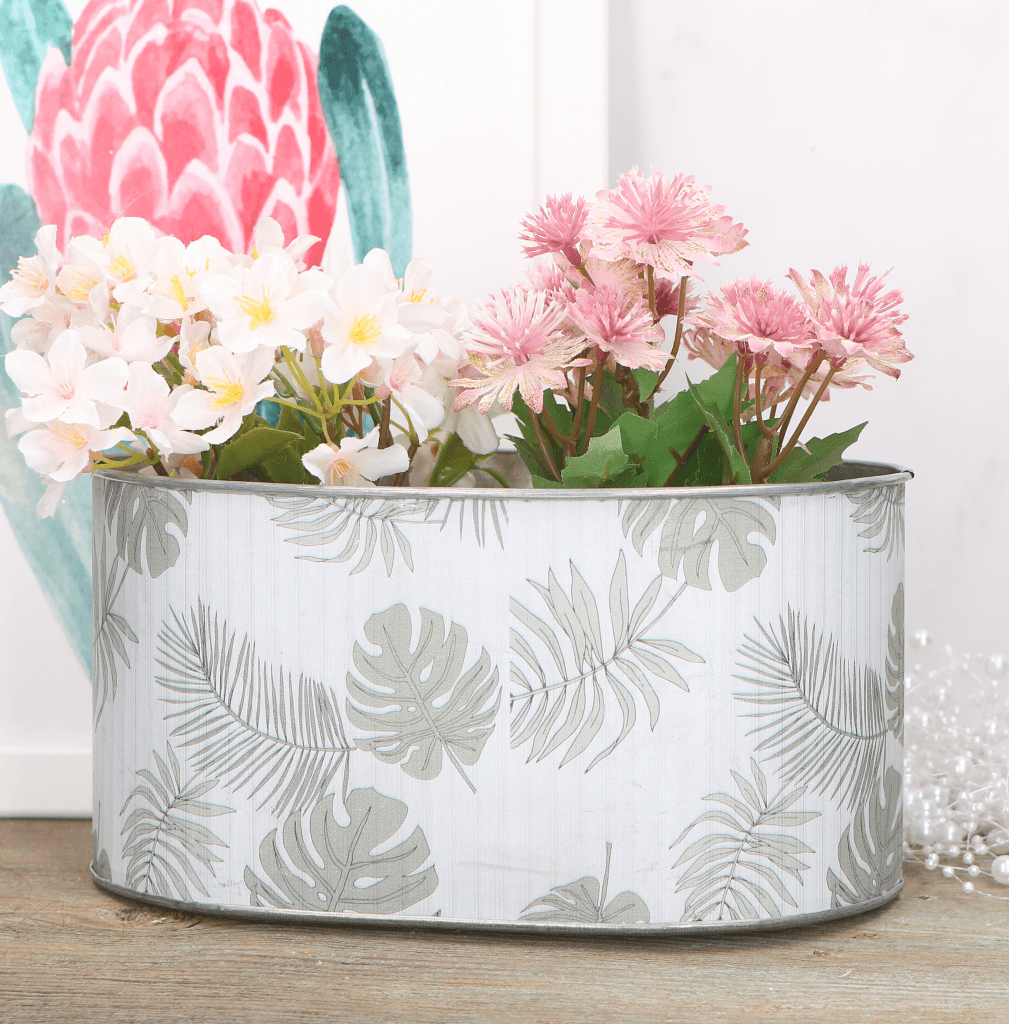Metalowa doniczka osłonka biała liście monstery 10cm