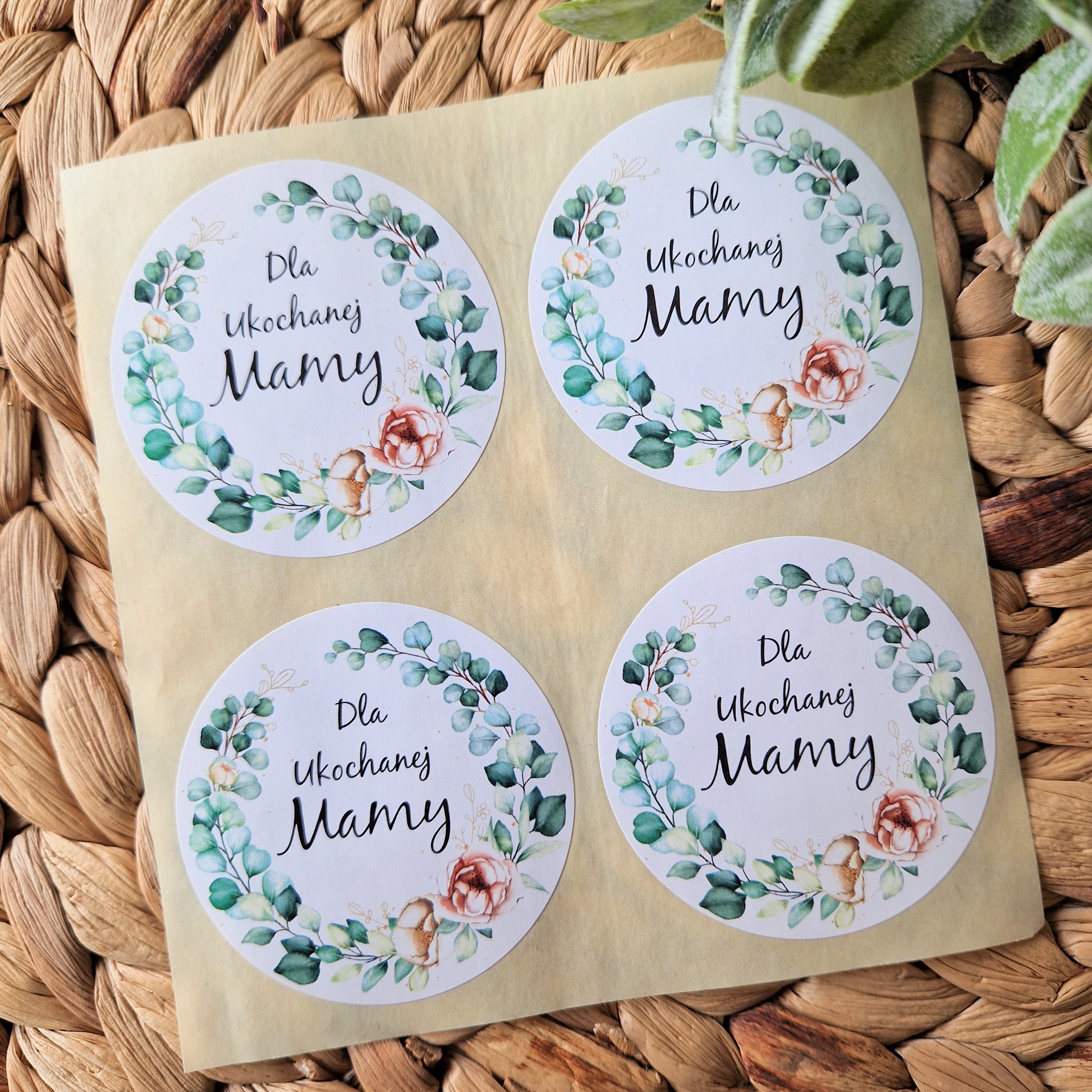 Okrągłe naklejki na Dzień Mamy z delikatnym wzorem kwiatowym.