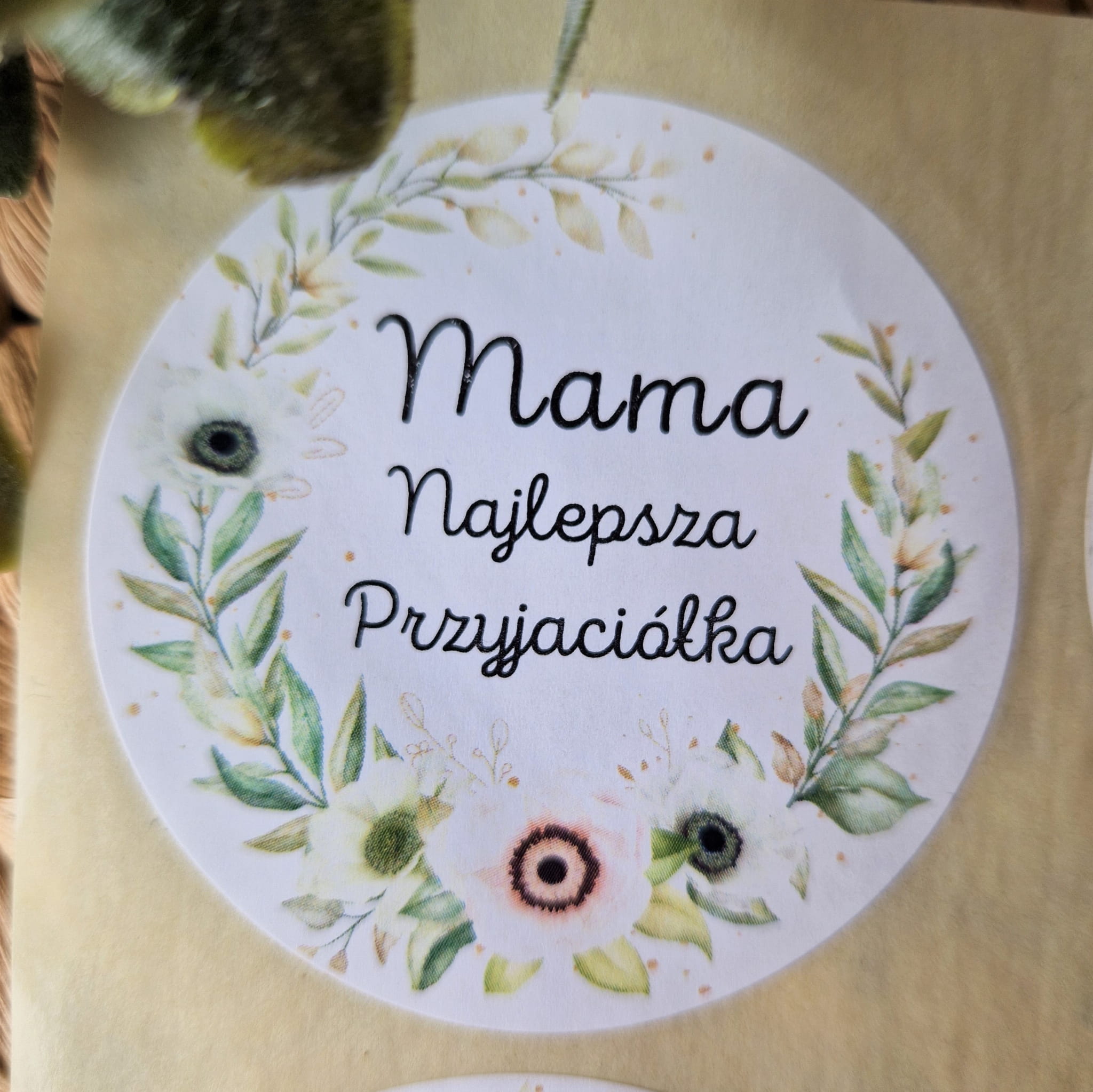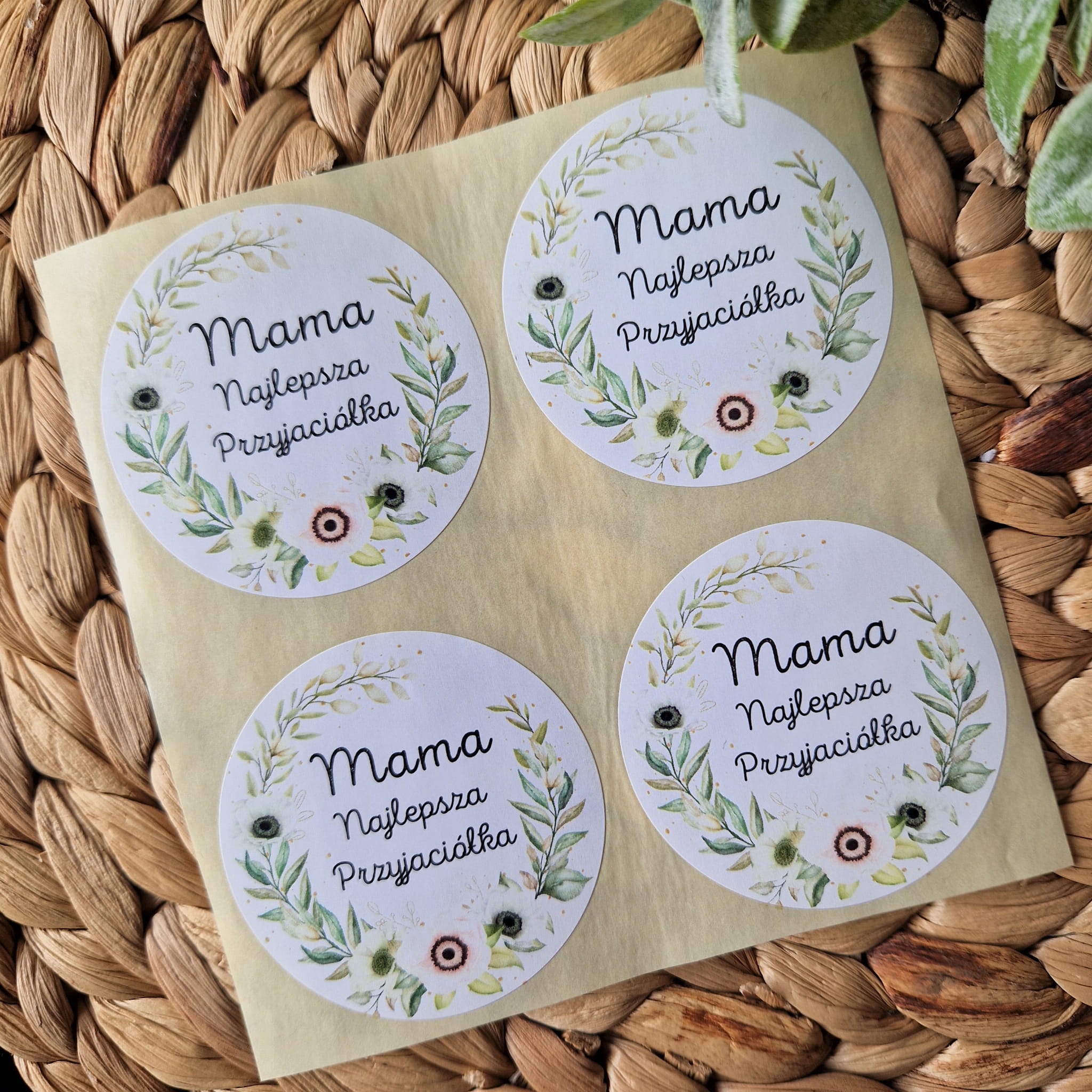 Okrągłe naklejki na Dzień Mamy z delikatnym wzorem kwiatowym.