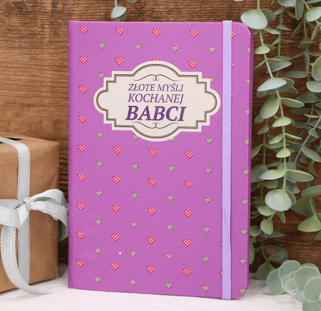 Elegancki notesik z napisem to idealny prezent na Dzień Babci, urodziny lub imieniny. Notesik w grubej okładce z gumką. Notes w linie.