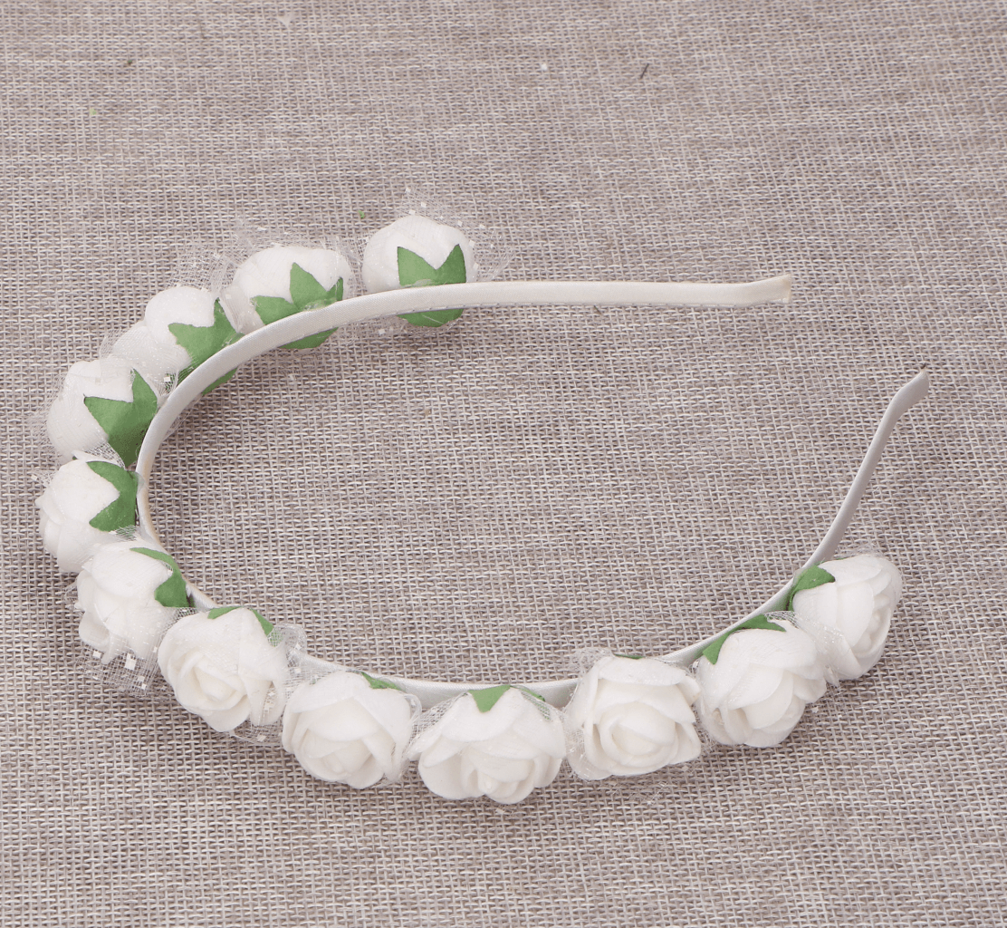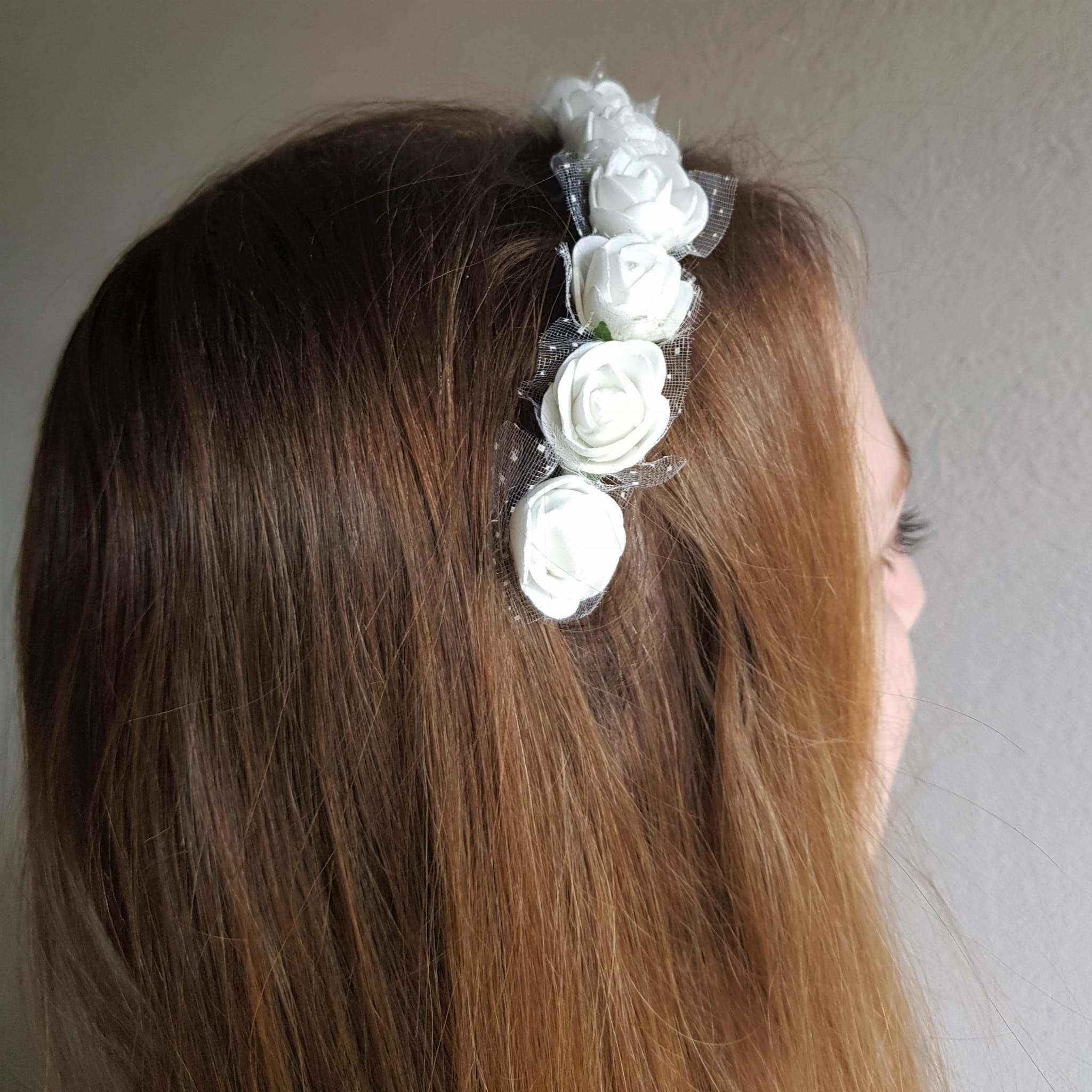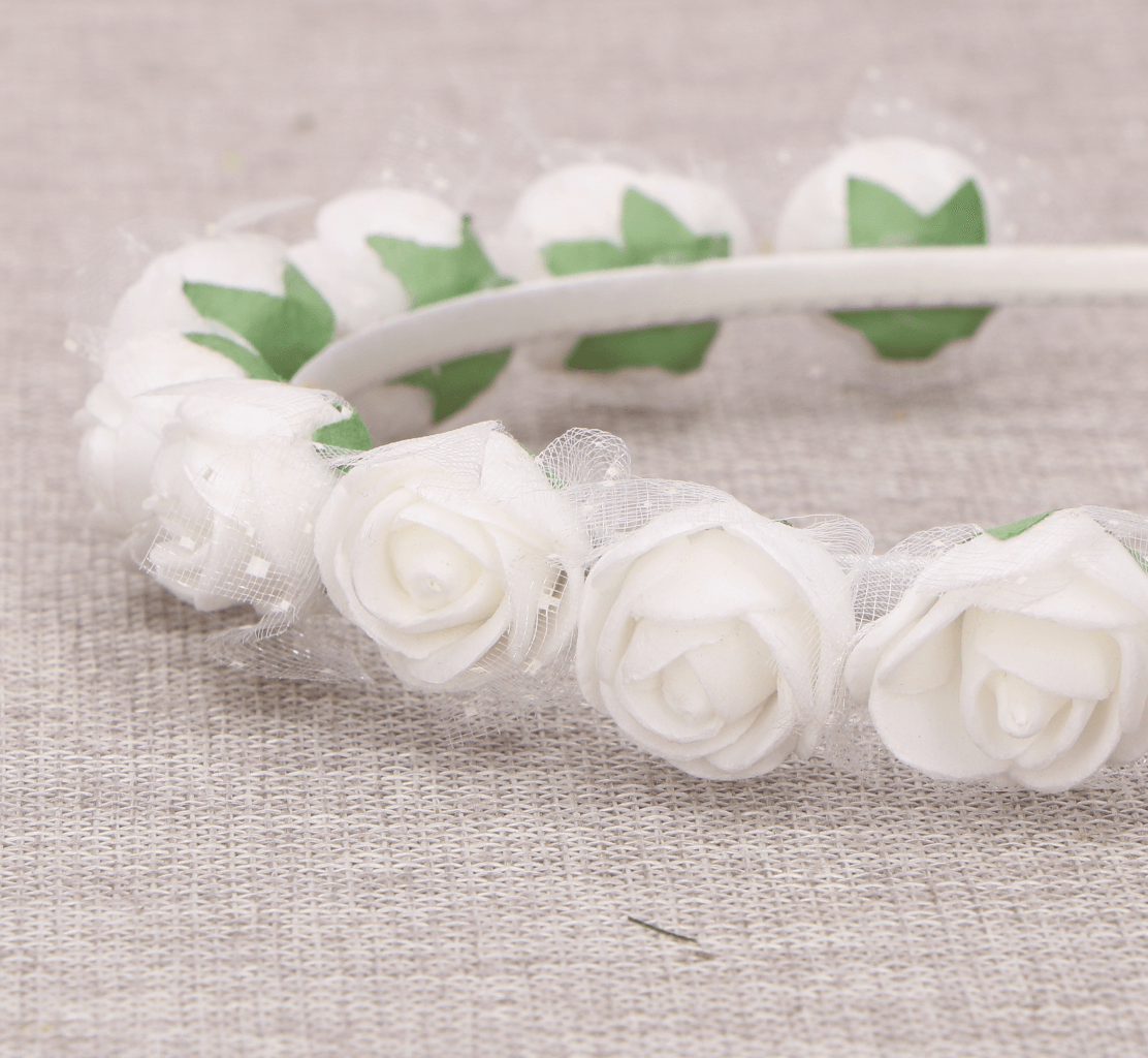 Opaska komunijna z białymi różyczkami z tiulem. Biel symbolizuje czystość i niewinność, a także odnowę życia duchowego.